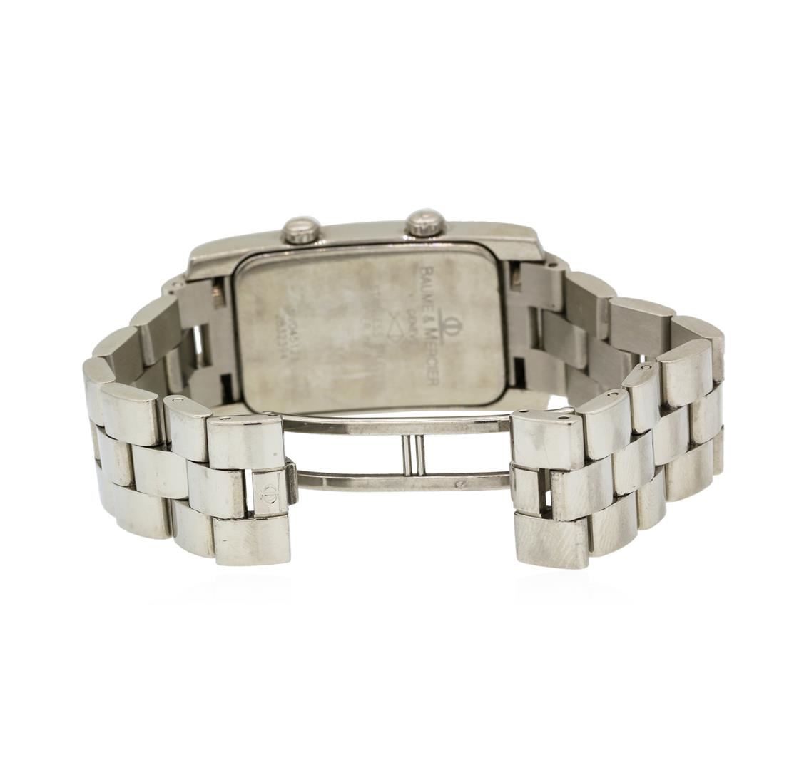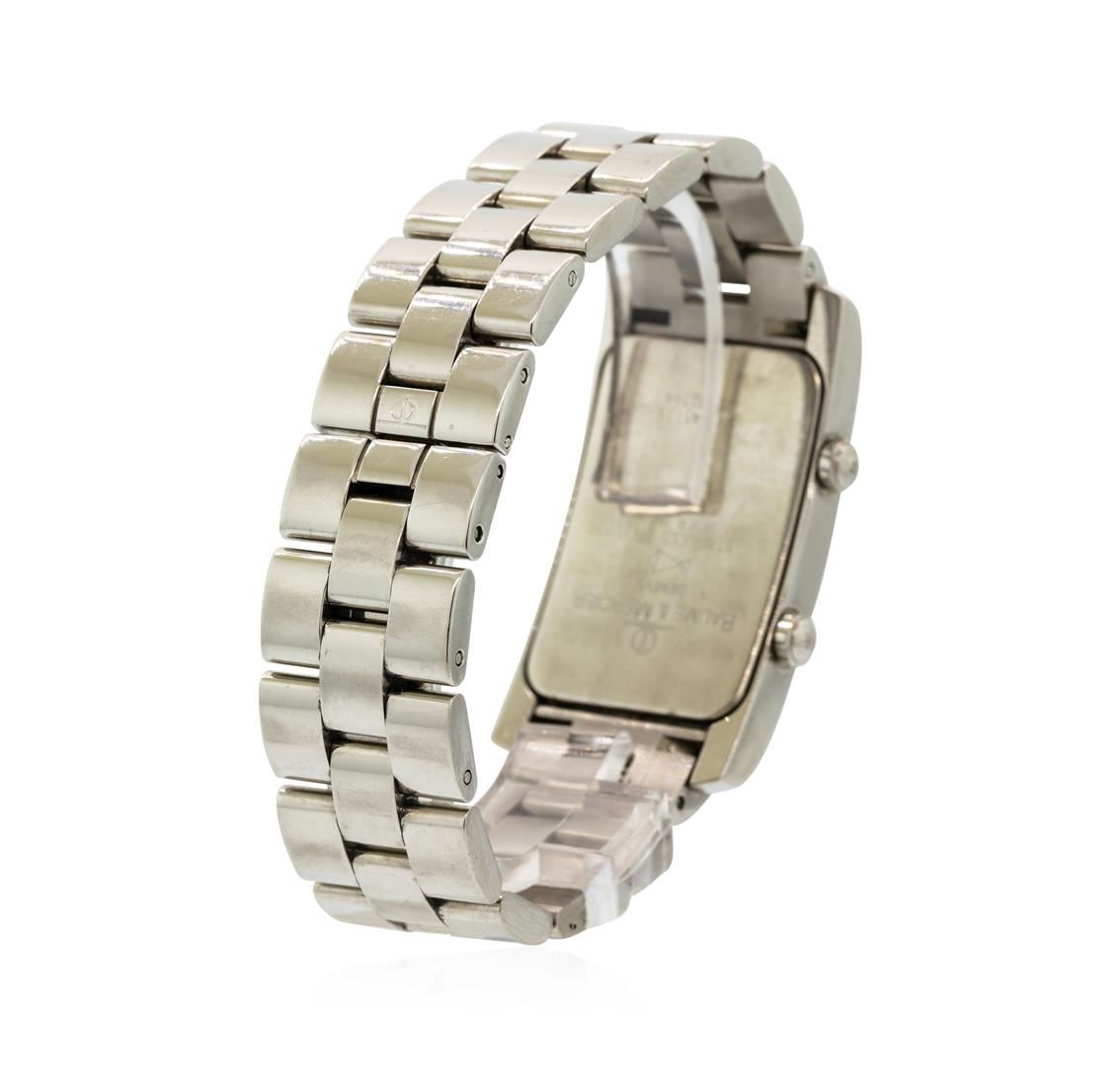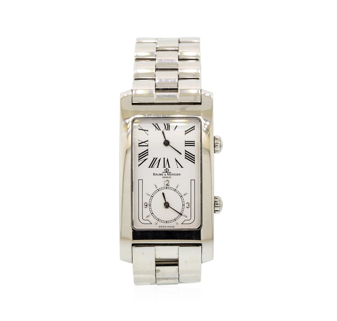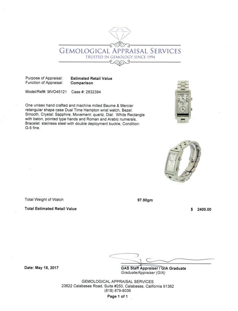 One unisex, hand crafted and machine milled Baume & Mercier retangular shape case Dual Time Hampton wrist watch, Bezel: Smooth, Crystal: Sapphire, Movement: quartz, Dial: White Rectangle with baton, pointed type hands and Roman and Arabic numerals, Bracel GAS Appraised at $2,400.00.