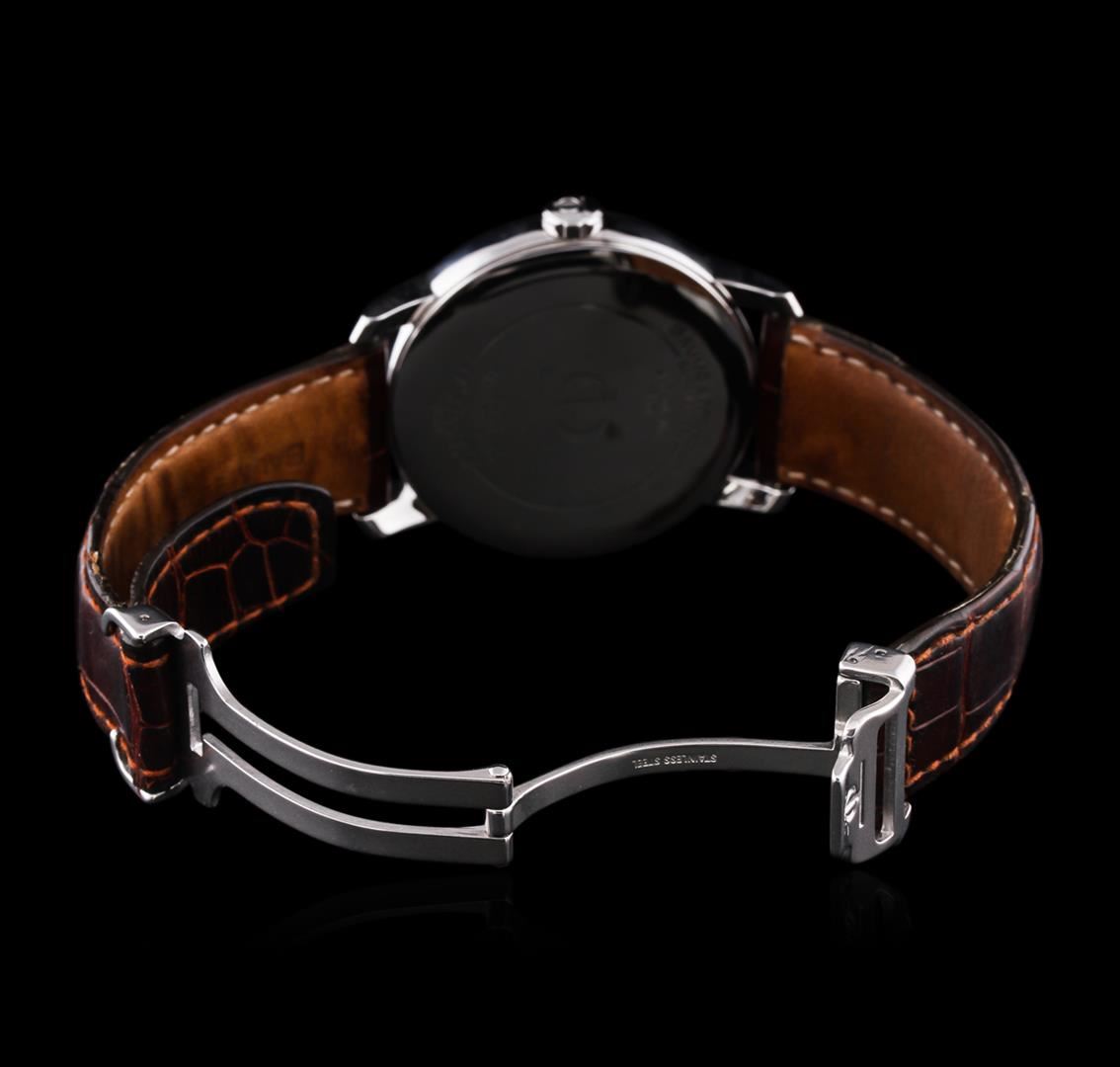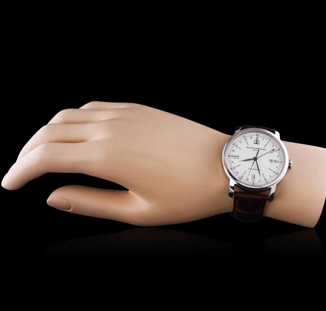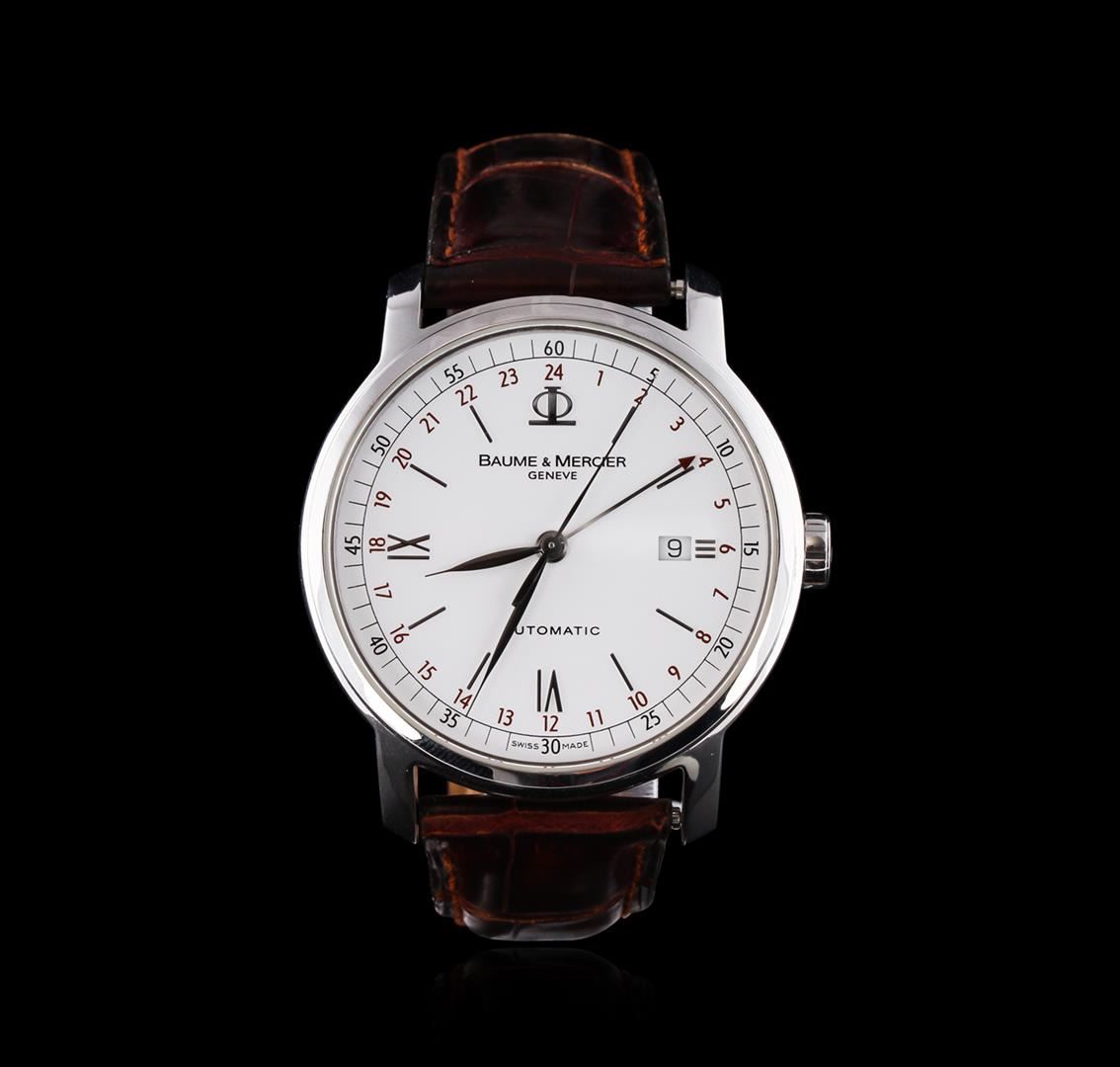 One Baume & Mercier Men's watch featuring: Movement: Automatic. Case: Stainless steel. Crown: Stainless steel. Bezel: Stainless steel. Dial: White color. Date window located at the 3 o'clock position. Strap: Brown leather.