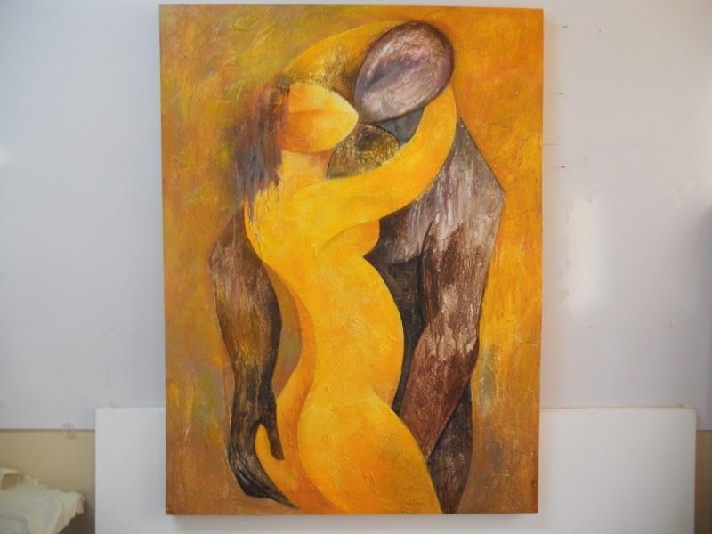 Arbe has exceeded expectations with creating this brightly colored homage to the famous French fable, (written in 1756 by Jeanne-Marie Leprince de Beaumont), it's theatrical play and the Disney musical "Beauty and the Beast". Here he captures, in modern terms, the oddly seductive & passionate nature of love between this beautiful young woman and her beast. This boxed canvas painting is suitable for display as is, or with a frame. Measures 48x36 inches.