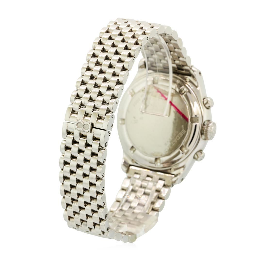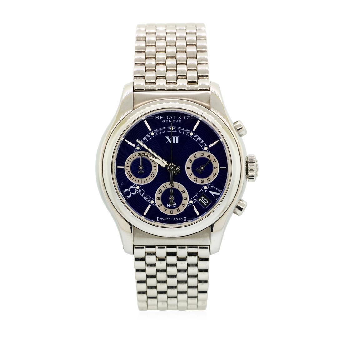 One, Bedat & Co. Chronograph wristwatch, electro-chemically tested Stainless Steel. Case: 38mm diameter, Case Back: engraved with the model information and ID numbers, Bezel: high polish finish, Crown: scalloped, engraved with the manufacturers logo, Crystal: synthetic sapphire. Movement: Automatic, Bedat & Co. signed Dial: Blue color, with luminous pointed hands & indices, Chronograph Functions: three sub-dials for continuous seconds, minutes, and hours, four o'clock position Date window. Bracelet: Stainless Steel links, adjustable eight and one half inch length. Bedat & Co. signed concealed deployment clasp. Twelve removable links. Condition: G-6 Extra Fine. Bright polish finish. Total Weight of Wristwatch 128.36gm. AIG Appraised at $3,050.00.