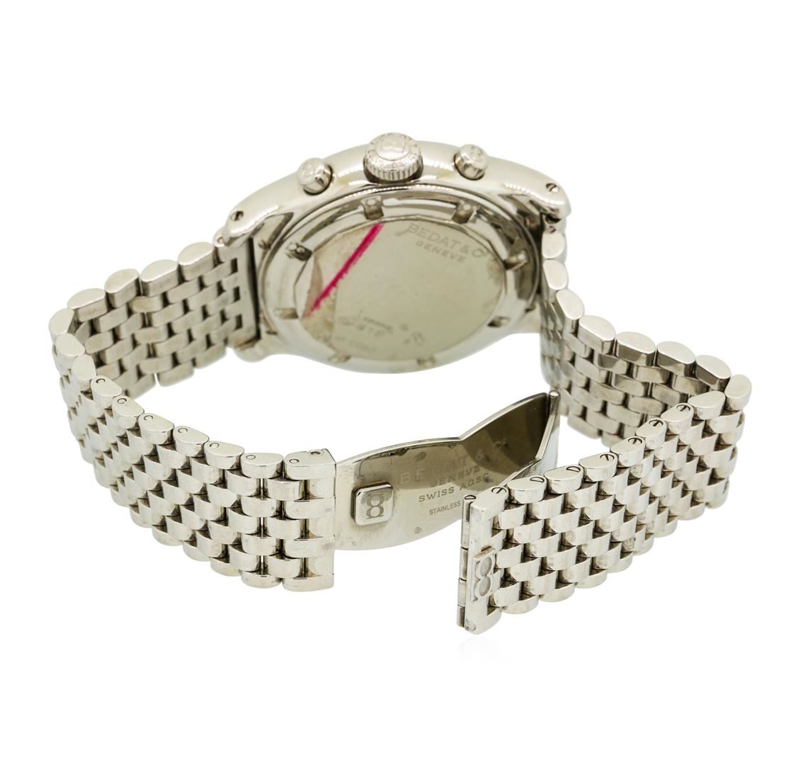 One, Bedat & Co. Chronograph wristwatch, electro-chemically tested Stainless Steel. Case: 38mm diameter, Case Back: engraved with the model information and ID numbers, Bezel: high polish finish, Crown: scalloped, engraved with the manufacturers logo, Crystal: synthetic sapphire. Movement: Automatic, Bedat & Co. signed Dial: Blue color, with luminous pointed hands & indices, Chronograph Functions: three sub-dials for continuous seconds, minutes, and hours, four o'clock position Date window. Bracelet: Stainless Steel links, adjustable eight and one half inch length. Bedat & Co. signed concealed deployment clasp. Twelve removable links. Condition: G-6 Extra Fine. Bright polish finish. Total Weight of Wristwatch 128.36gm. AIG Appraised at $3,050.00.