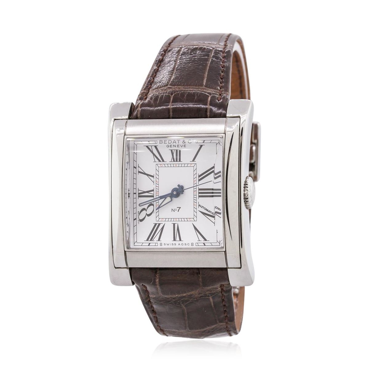 One Bedat & Co No. 7 wristwatch featuring: brown leather bracelet, Stainless Steel bezel, case, crown, and lugs, white dial with analog display,, Roman and Arabic numerals, Swiss movement, blue hour, minute and second hands. This item measures 33mm across, including crown, and weighs a total of 78.90 grams.