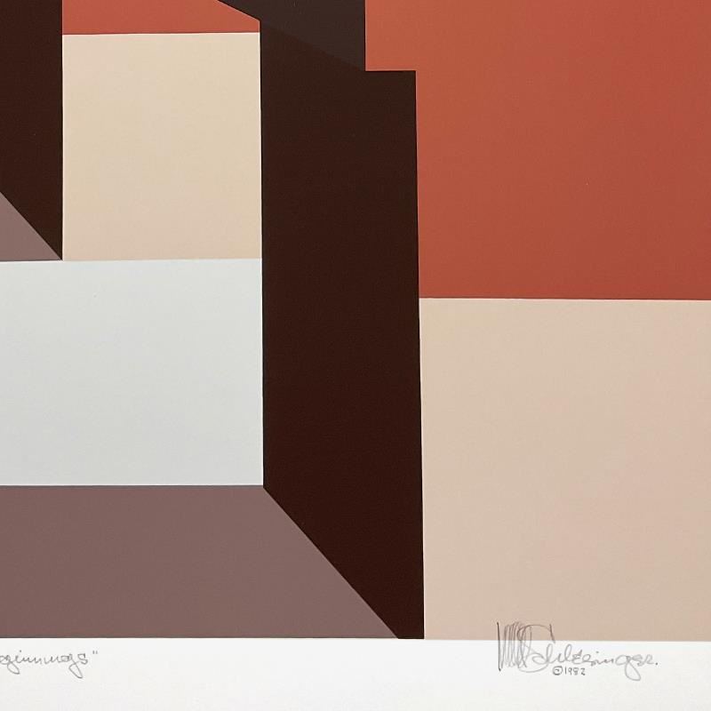 "Beginnings" is a limited edition serigraph from an HC Edition on paper by William Schlesinger (1915-2011), hand signed by the artist. Includes Letter of Authenticity. Measures approx. 28.5" x 28" (border), 22.5" x 26" (image). The top corners are bent; t