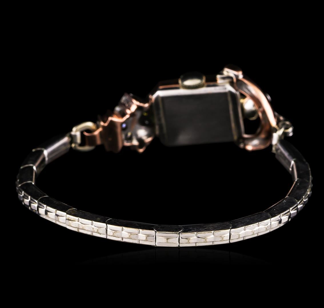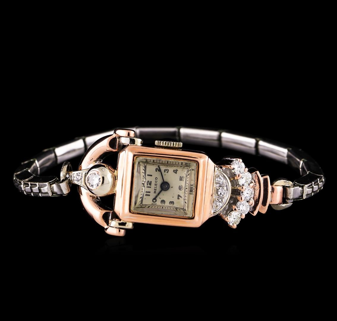 One ladies, vintage Beleco stylized Art Deco period design wristwatch electronically tested 14KT white & rose gold, Case: 17mm x 13mm, Case Back: space available for engraving, Fixed Case Lugs: set with diamonds, Crown: scalloped edge, Bezel: polished, Crystal: acrylic. Milus Movement: seventeen jewel unadjusted mechanical stem wind, Dial: Ivory color, Blue steel lance hands, numerals, and a bordering minute track with bolded five minute intervals, Kreisler Bracelet: flexible stainless steel, Condition: G- 5 Fine. Seven inch length, adjustable. Containing: Six prong set round brilliant and single cut diamonds, measuring 2.80 x 2.50 x 1.59mm (depth est.) approximate total weight of 6 Stones = 0.51ct. Clarity: SI-1 to I-1. Color: H - J Six bead set single cut diamonds, measuring 1.60 - 1.30 x 0.87mm (depth est.) approximate total weight of 6 Stones = 0.08ct. Clarity: VS-2 to SI-1. Color: H - I. Total Weight of Diamonds 0.59ct. Total Weight of Watch 25.64gm. AIG Appraised at $4,240.00.