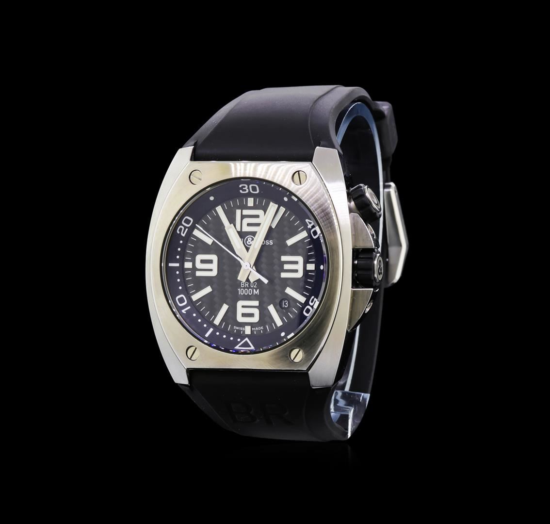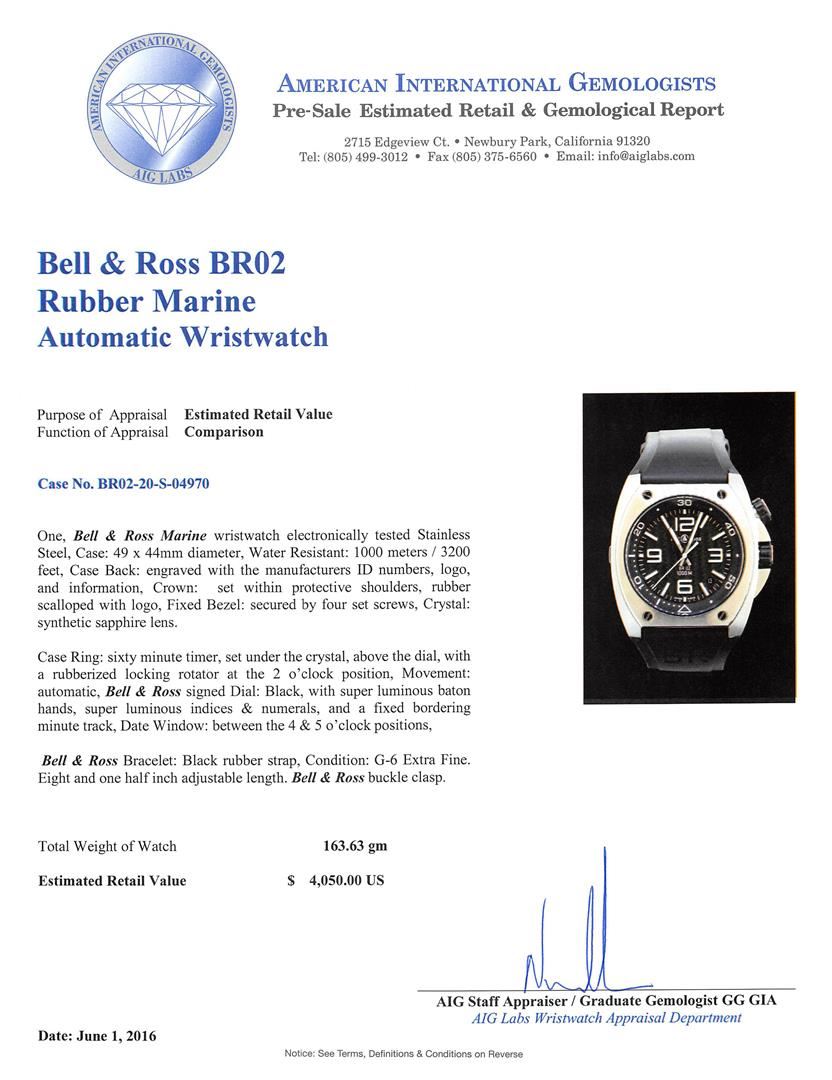 One, Bell & Ross Marine wristwatch electronically tested Stainless Steel, Case: 49 x 44mm diameter, Water Resistant: 1000 meters / 3200 feet, Case Back: engraved with the manufacturers ID numbers, logo, and information, Crown: set within protective shoulders, rubber scalloped with logo, Fixed Bezel: secured by four set screws, Crystal: synthetic sapphire lens. Case Ring: sixty minute timer, set under the crystal, above the dial, with a rubberized locking rotator at the 2 o'clock position, Movement: automatic, Bell & Ross signed Dial: Black, with super luminous baton hands, super luminous indices & numerals, and a fixed bordering minute track, Date Window: between the 4 & 5 o'clock positions, Bell & Ross Bracelet: Black rubber strap, Condition: G-6 Extra Fine. Eight and one half inch adjustable length. Bell & Ross buckle clasp. Total Weight of Watch 163.63gm. AIG Appraised at $4,050.00.