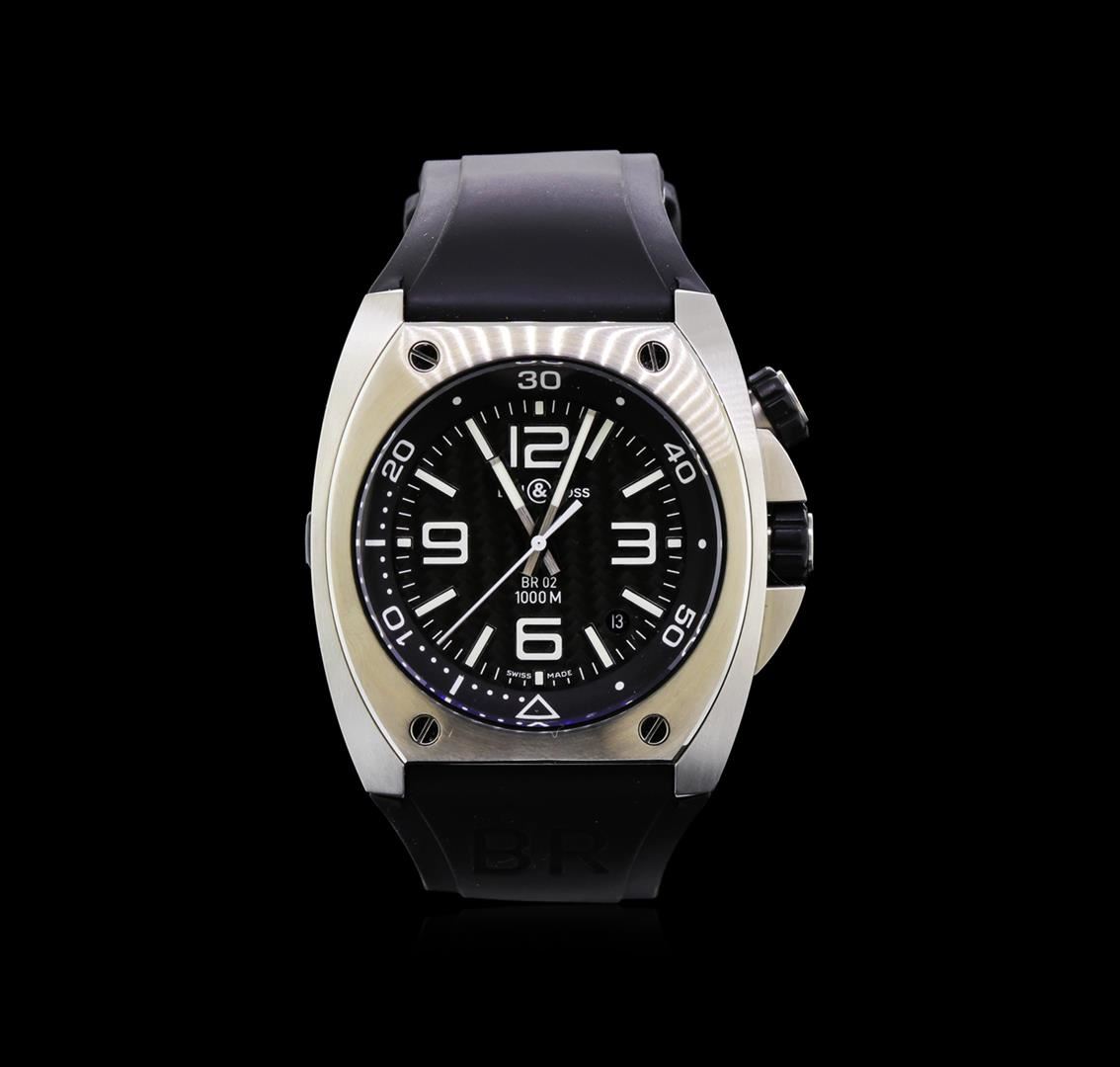 One, Bell & Ross Marine wristwatch electronically tested Stainless Steel, Case: 49 x 44mm diameter, Water Resistant: 1000 meters / 3200 feet, Case Back: engraved with the manufacturers ID numbers, logo, and information, Crown: set within protective shoulders, rubber scalloped with logo, Fixed Bezel: secured by four set screws, Crystal: synthetic sapphire lens. Case Ring: sixty minute timer, set under the crystal, above the dial, with a rubberized locking rotator at the 2 o'clock position, Movement: automatic, Bell & Ross signed Dial: Black, with super luminous baton hands, super luminous indices & numerals, and a fixed bordering minute track, Date Window: between the 4 & 5 o'clock positions, Bell & Ross Bracelet: Black rubber strap, Condition: G-6 Extra Fine. Eight and one half inch adjustable length. Bell & Ross buckle clasp. Total Weight of Watch 163.63gm. AIG Appraised at $4,050.00.
