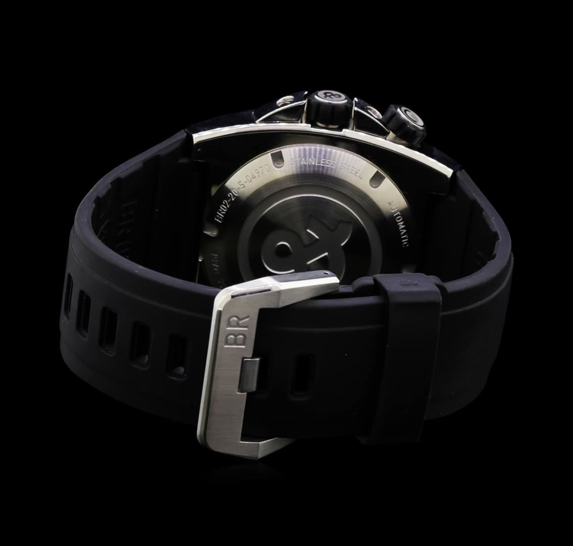 One, Bell & Ross Marine wristwatch electronically tested Stainless Steel, Case: 49 x 44mm diameter, Water Resistant: 1000 meters / 3200 feet, Case Back: engraved with the manufacturers ID numbers, logo, and information, Crown: set within protective shoulders, rubber scalloped with logo, Fixed Bezel: secured by four set screws, Crystal: synthetic sapphire lens. Case Ring: sixty minute timer, set under the crystal, above the dial, with a rubberized locking rotator at the 2 o'clock position, Movement: automatic, Bell & Ross signed Dial: Black, with super luminous baton hands, super luminous indices & numerals, and a fixed bordering minute track, Date Window: between the 4 & 5 o'clock positions, Bell & Ross Bracelet: Black rubber strap, Condition: G-6 Extra Fine. Eight and one half inch adjustable length. Bell & Ross buckle clasp. Total Weight of Watch 163.63gm. AIG Appraised at $4,050.00.
