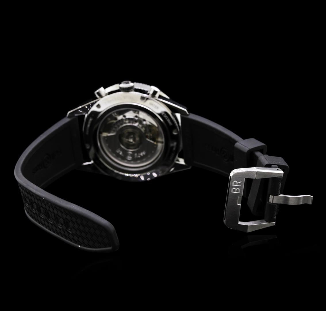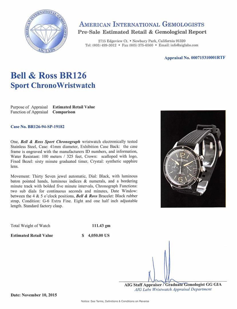 One, Bell & Ross Sport Chronograph wristwatch electronically tested Stainless Steel, Case: 41mm diameter, Exhibition Case Back: the case frame is engraved with the manufacturers ID numbers, and information, Water resistant: 100 meters / 325 feet, Crown: scalloped with logo, Fixed Bezel: sixty minute graduated timer, Crystal: synthetic sapphire lens. Movement: Thirty Seven jewel automatic, Dial: Black, with luminous baton pointed hands, luminous indices & numerals, and a bordering minute track with bolded five minute intervals, Chronograph Functions: two sub dials for continuous seconds and minutes, Date Window: between the 4 & 5 o'clock positions, Bell & Ross Bracelet: Black rubber strap, Condition: G-6 Extra Fine. Eight and one half inch adjustable length. Standard factory clasp. Total Weight of Watch 111.43gm. AIG Appraised at $4,050.00.