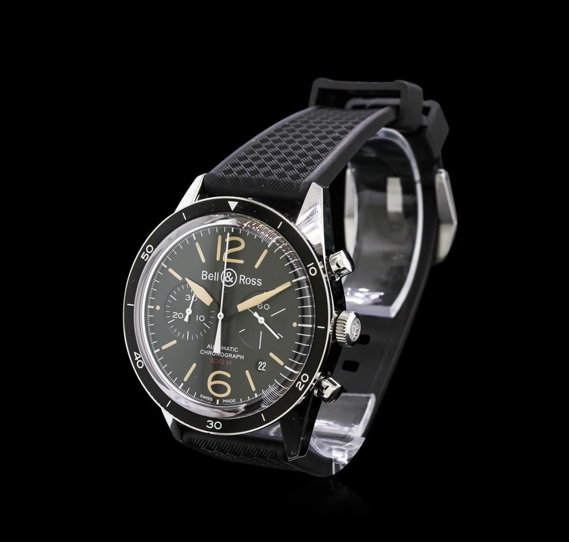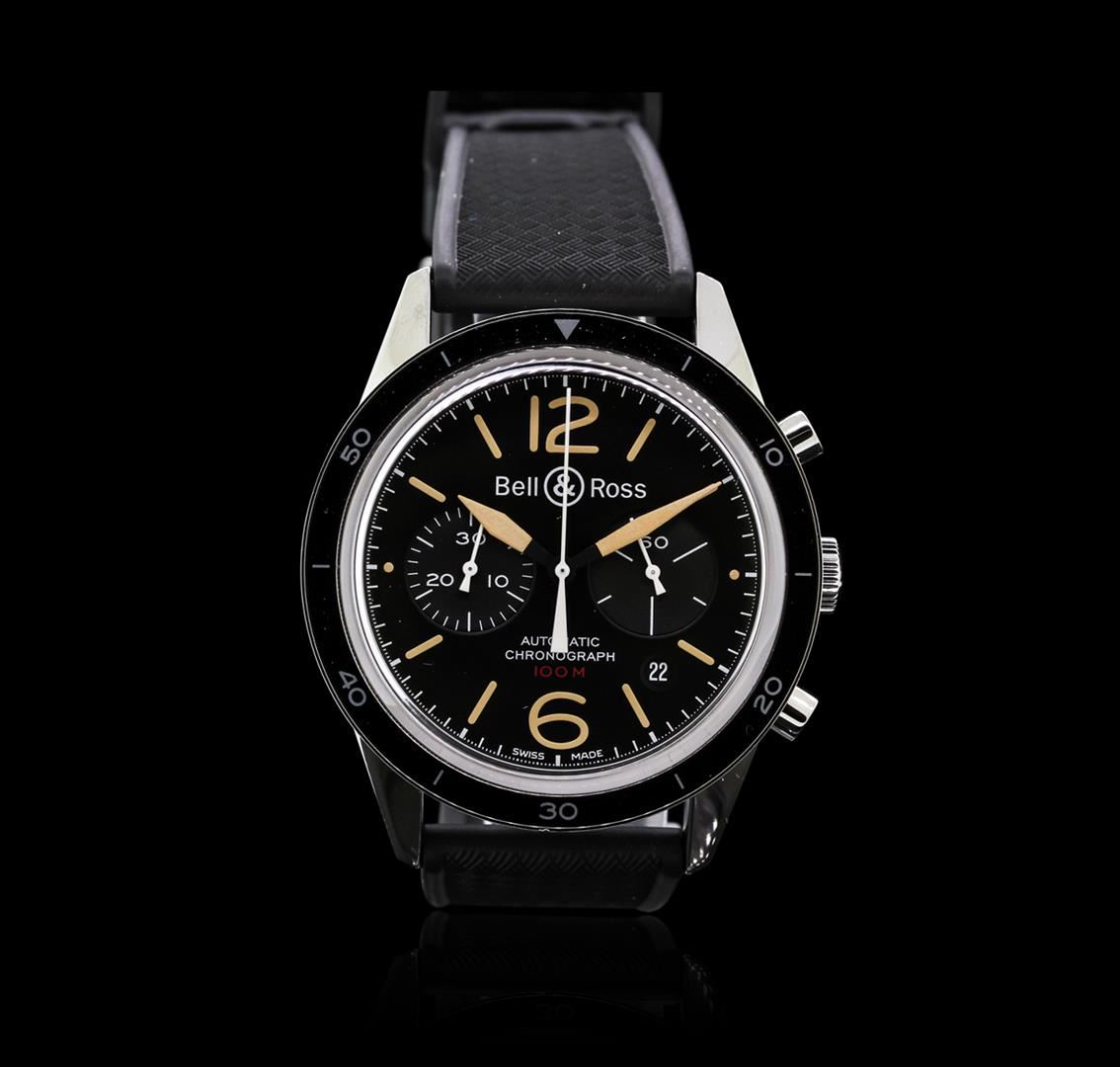 One, Bell & Ross Sport Chronograph wristwatch electronically tested Stainless Steel, Case: 41mm diameter, Exhibition Case Back: the case frame is engraved with the manufacturers ID numbers, and information, Water resistant: 100 meters / 325 feet, Crown: scalloped with logo, Fixed Bezel: sixty minute graduated timer, Crystal: synthetic sapphire lens. Movement: Thirty Seven jewel automatic, Dial: Black, with luminous baton pointed hands, luminous indices & numerals, and a bordering minute track with bolded five minute intervals, Chronograph Functions: two sub dials for continuous seconds and minutes, Date Window: between the 4 & 5 o'clock positions, Bell & Ross Bracelet: Black rubber strap, Condition: G-6 Extra Fine. Eight and one half inch adjustable length. Standard factory clasp. Total Weight of Watch 111.43gm. AIG Appraised at $4,050.00.