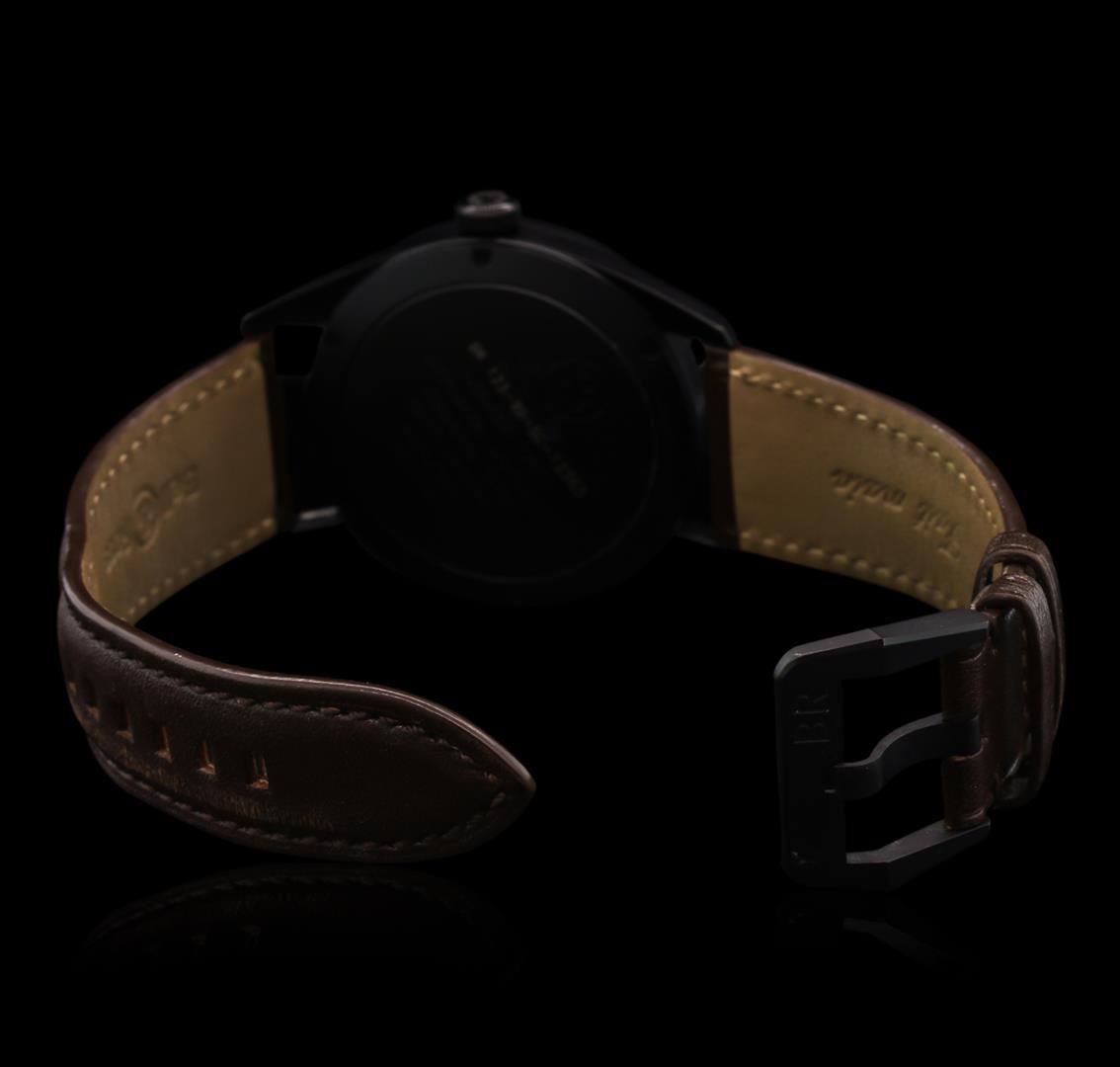 One Bell & Ross stainless steel mens watch. Strap: brown leather. Case: stainless steel black PVD. Dial: black with one subdial with second hand and date located at the 6 o'clock position.