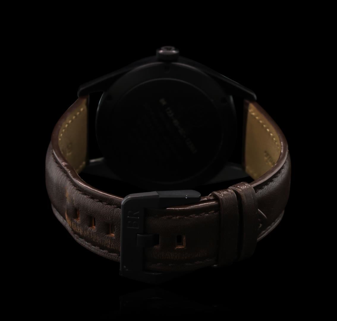 One Bell & Ross stainless steel mens watch. Strap: brown leather. Case: stainless steel black PVD. Dial: black with one subdial with second hand and date located at the 6 o'clock position. The leather strap shows signs of wear.