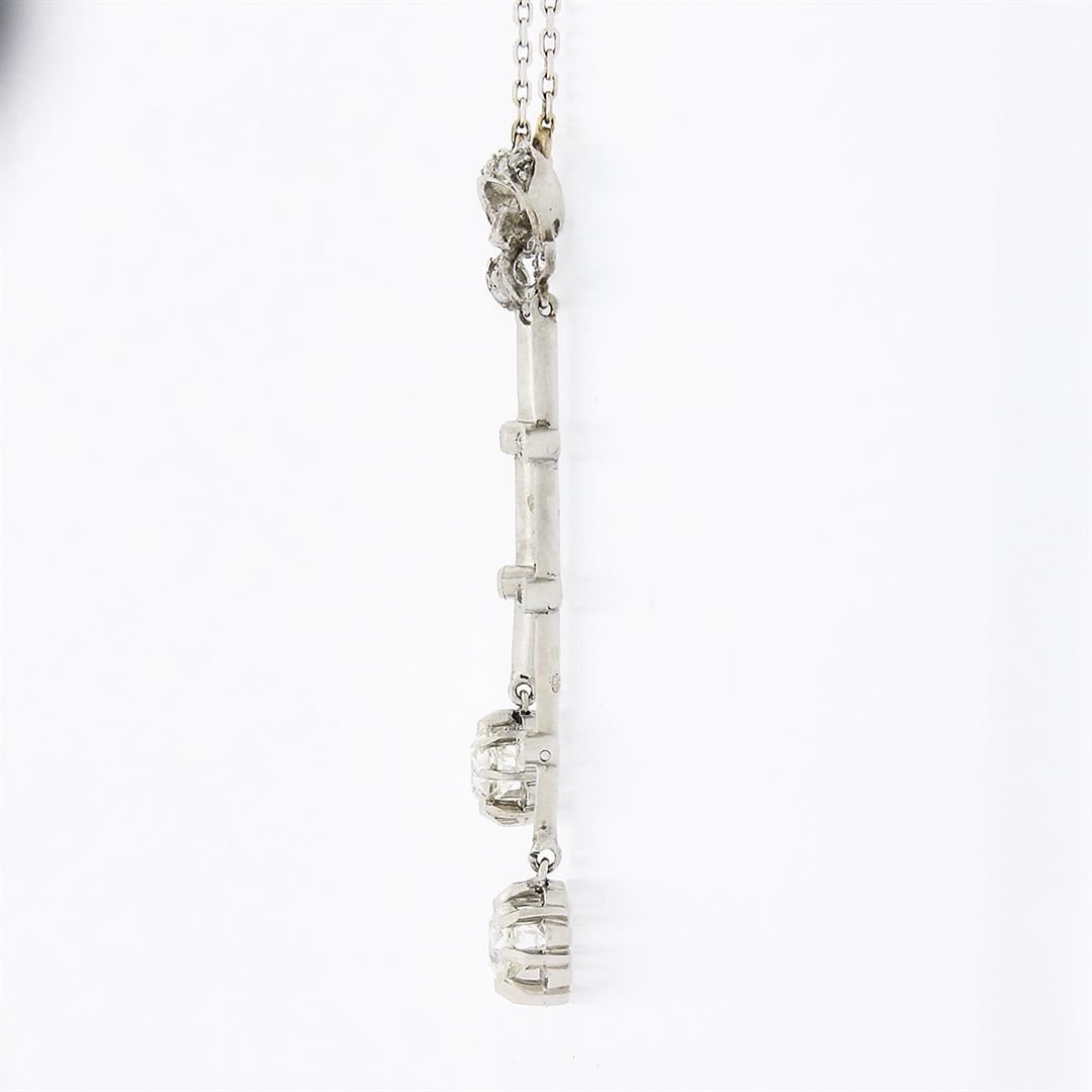 A solid 18k white gold dangle pendant necklace, featuring 26 old rose & old single cut natural diamonds (VS2/I1 ; 0.40ctw), and 2 old European cut natural diamonds (G/H - VS1/VS2 ; 1.06ctw). 14.75 inch cable link chain, 7.0 grams total weight, pendant measures 52.70x24.20mm.