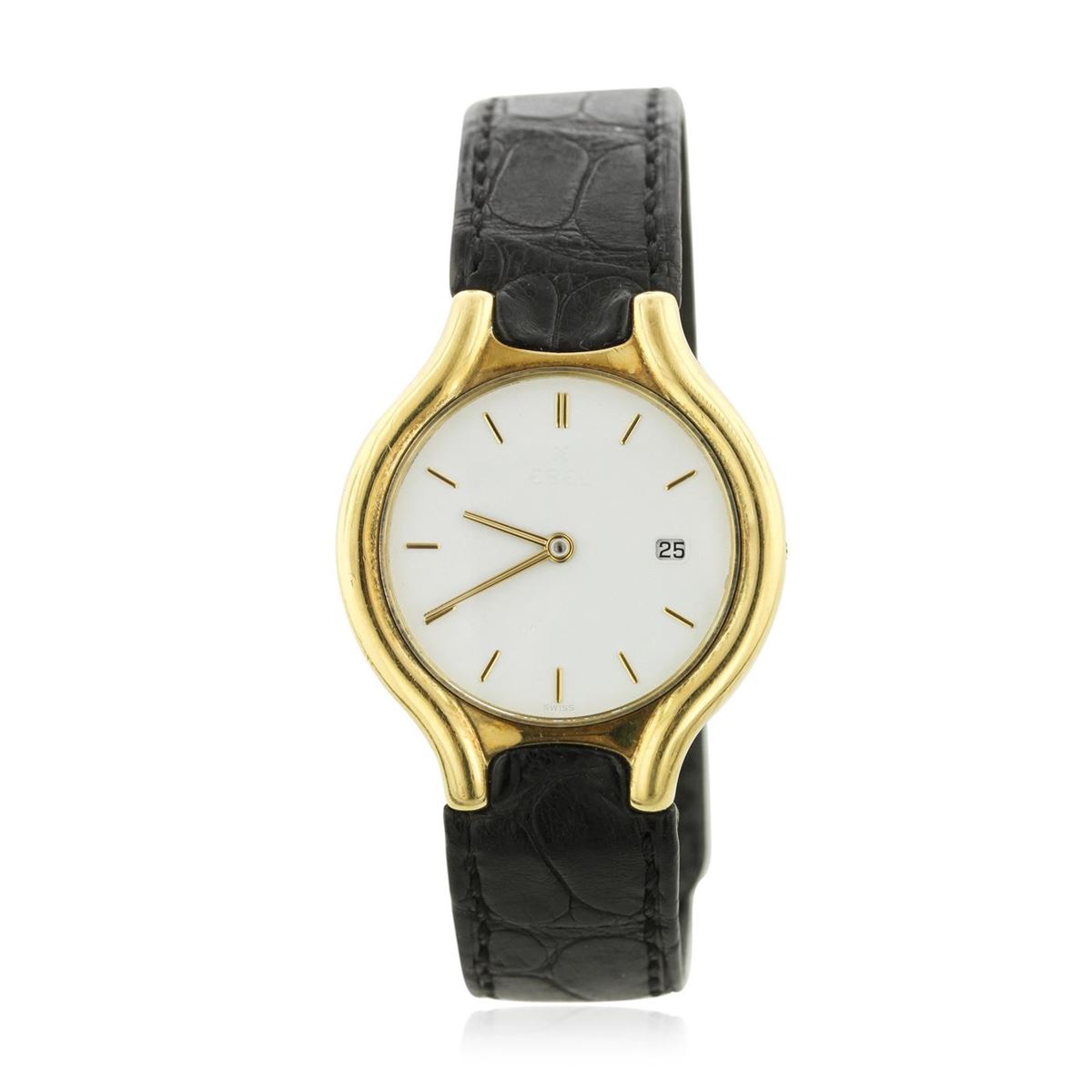 One ladies 18KT Yellow Gold Ebel Beluga Wristwatch featuring: White Crème Dial with faint Ebel name and logo under 12 o'clock, Small Date at 3 o'clock position, Analog Display, Gold Hour Markers, Gold Minute and Hour Hands, Gold Crown, 31mm Case, and Lugs, Black Leather Strap, 18KT Yellow Gold Ebel Deployment Clasp, Quartz Battery Movement, Sapphire Crystal, markings of 3542 Swiss made, Model 884960, Serial 43102035.