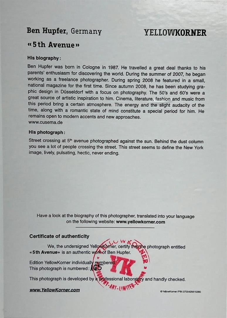 Ben Hupfer Germany 5Th Avenue YellowKorner Certified Photograph. Certificate of Authenticity from YellowKorner affixed to the back. Matted Dimensions 16"x20". Protected with Clear Mylar Sleeve.