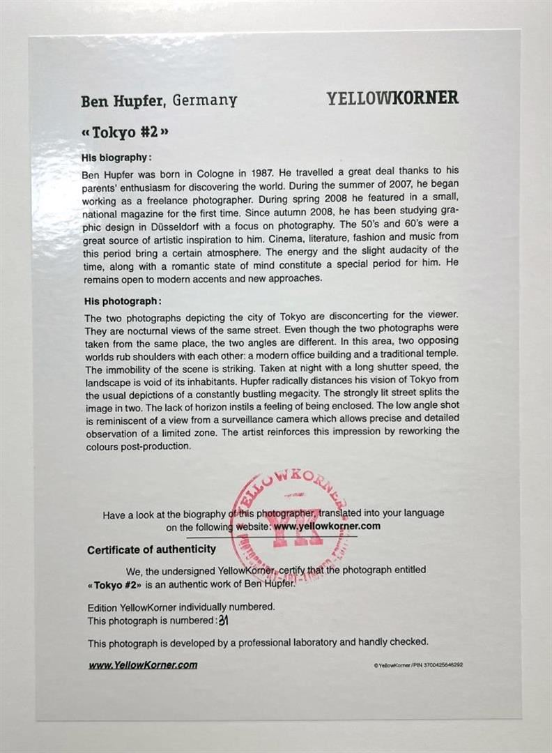 Ben Hupfer Tokyo #2 YellowKorner Certified Photograph. Certificate of Authenticity from YellowKorner affixed to the back. Matted Dimensions 16"x20". Protected with Clear Mylar Sleeve.