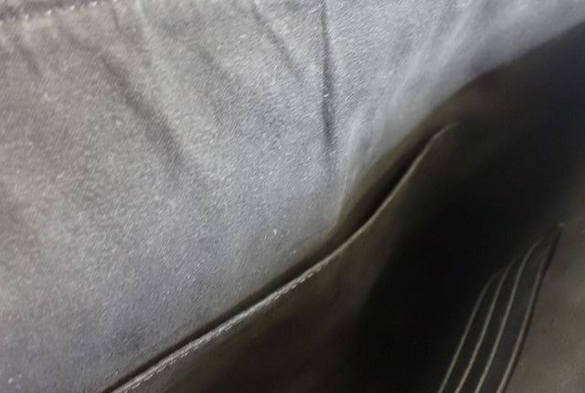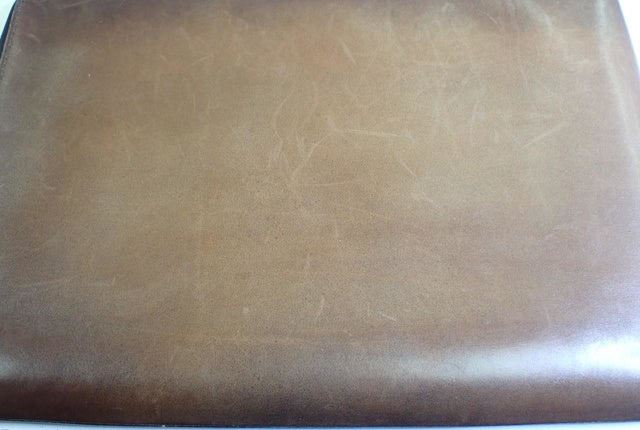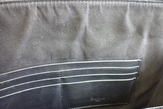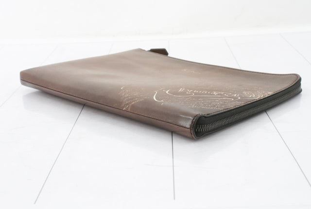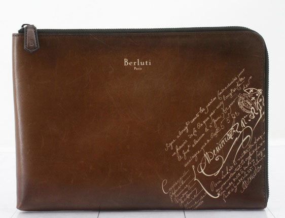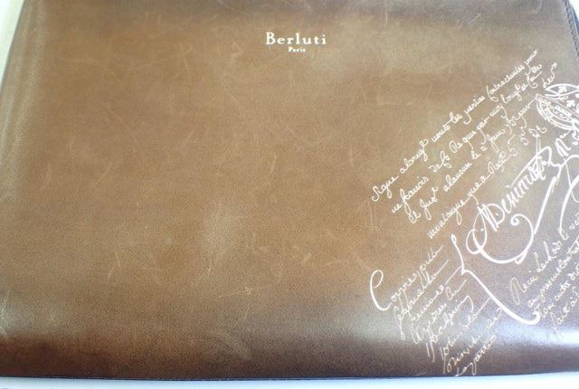 Berluti Calligraphy Nino GM document bag features brown Venetian leather with calligraphy in white, gun-metal hardware, zip-around closure with brown leather zipper puller, black canvas and leather lining, six card slots and two slip pocket. x 21cm x