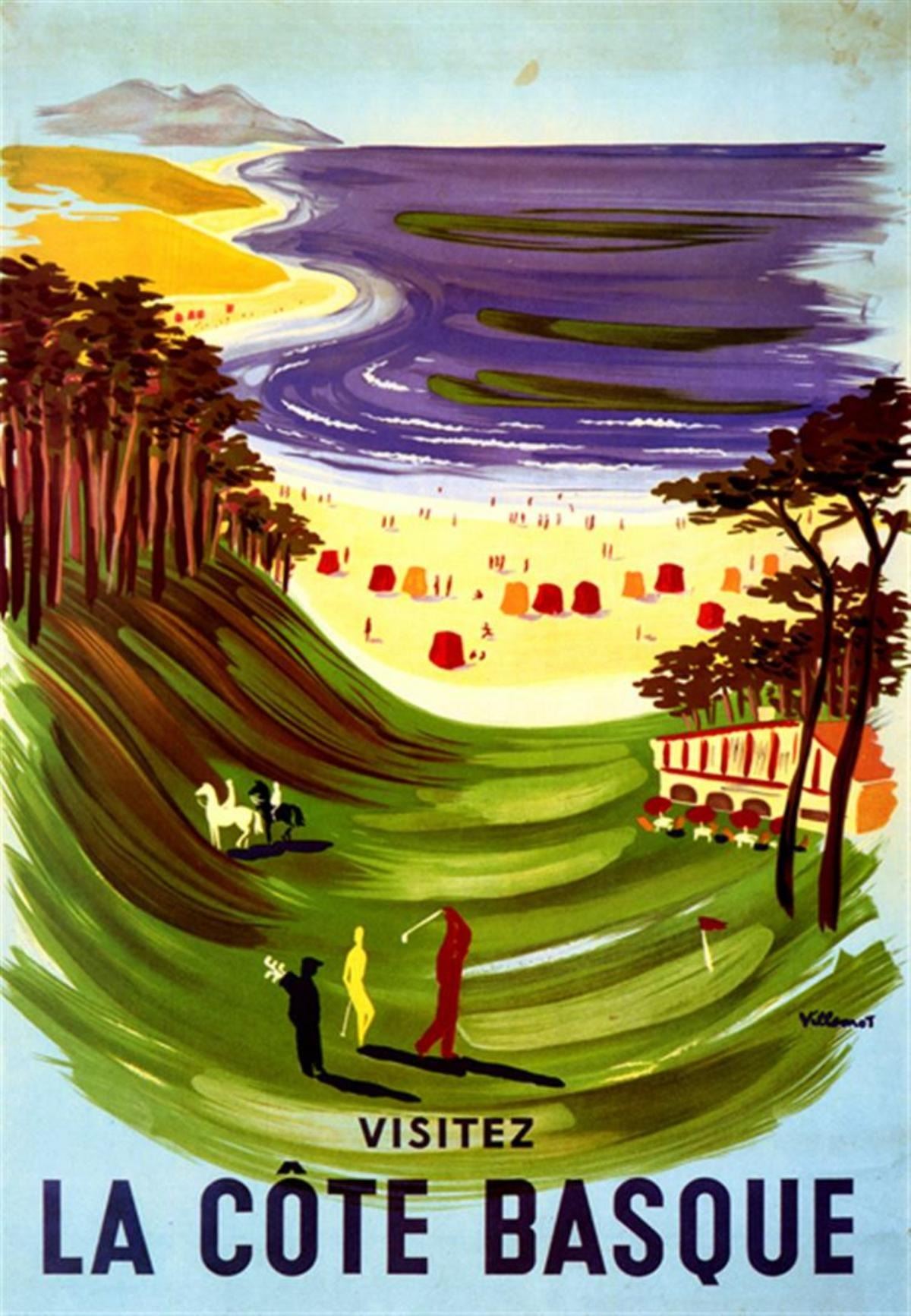 Artist: Bernard Villemot Title: La Cote Basque Medium: Fine Art Reproduction Giclee on Canvas Image Size: Approximately 32 inches x 22 inches Unframed on Unstretched Canvas Biography: Bernard Villemot was born in 1911 at Trouville-sur-Mer (Calvados), France. He studied art at the Julian Academy in Paris. He designed his first poster in 1936. His poster designs are noted for their use of vivid colors and bold forms.