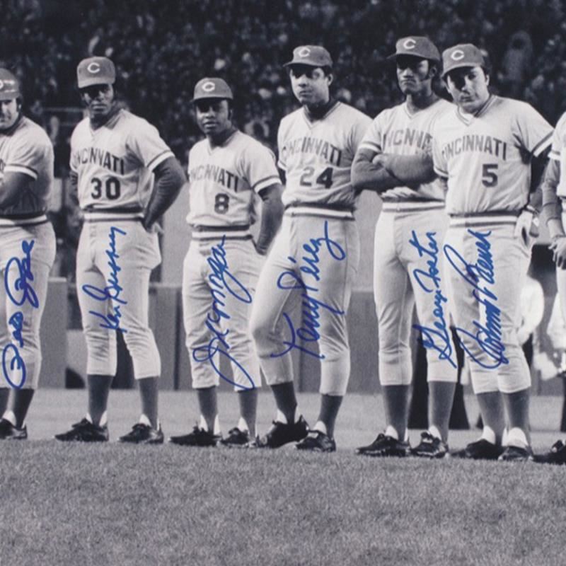 Big Red Machine Line-Up by Rose, Pete. "Big Red Machine Line-Up" is a lithograph featuring signatures from the Big Red Machine's starting eight; Johnny Bench (c), Tony Perez (1b), Joe Morgan (2b), Dave Concepcion (ss), Pete Rose (3b), Ken Griffey (rf), Cesar Geronimo (cf) and Geoge Foster (lf). The Reds became the first NL team since the 1921-1922 New York Giants to win consecutive World Series championships. The Big Red Machine of 1975-1976 is considered one of the best teams ever. This piece comes framed. Includes Certificate of Authenticity. Measures approx. 26" x 22" (frame), 20" x 16" (image).