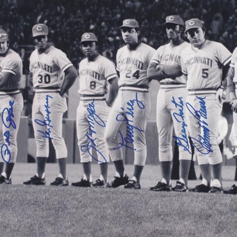 "Big Red Machine Line-Up" is a lithograph featuring signatures from the Big Red Machine's starting eight; Johnny Bench (c), Tony Perez (1b), Joe Morgan (2b), Dave Concepcion (ss), Pete Rose (3b), Ken Griffey (rf), Cesar Geronimo (cf) and Geoge Foster (lf). The Reds became the first NL team since the 1921-1922 New York Giants to win consecutive World Series championships. The Big Red Machine of 1975-1976 is considered one of the best teams ever. Includes Certificate of Authenticity. Measures approx. 20" x 16" (image).