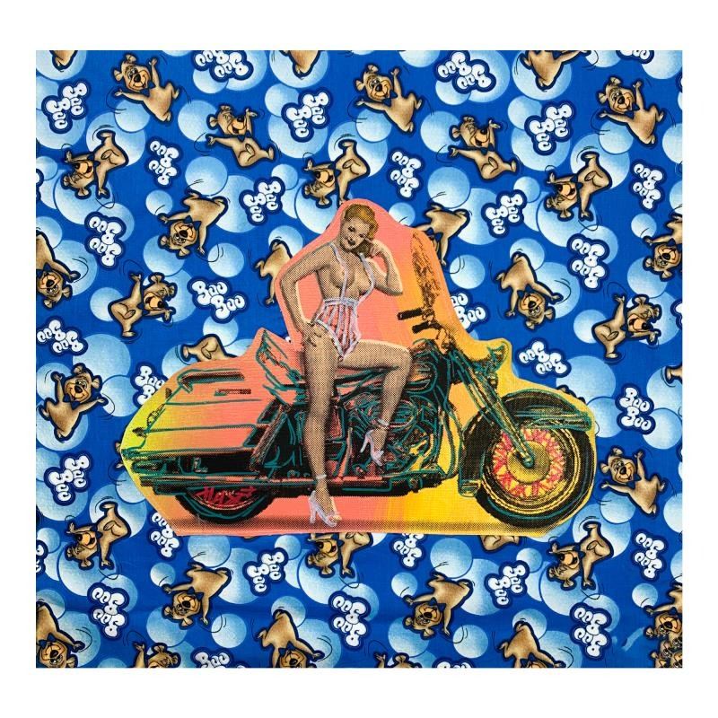 "Biker Gal" is limited edition hand pulled silkscreen unique mixed media on canvas and textile by Andy Warhol protege Steve Kaufman (1960-2010). This piece is numbered and hand signed inverso and includes a letter of authenticity. As is common with Kaufman's works, this piece may have perceived minor flaws, but is in overall good condition. Measures approximately 21" x 21" before cropping.