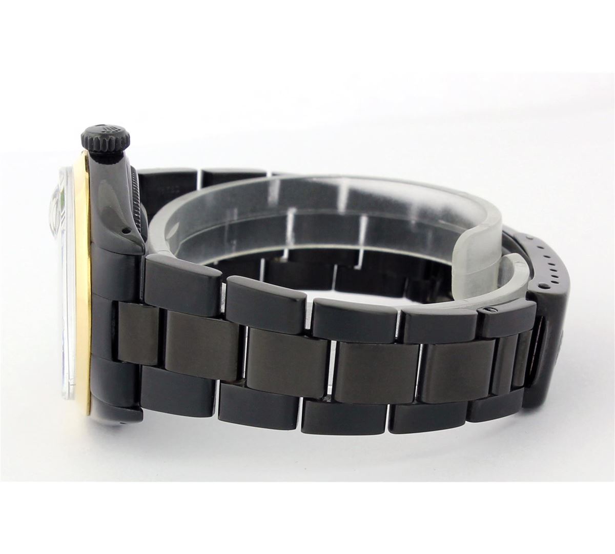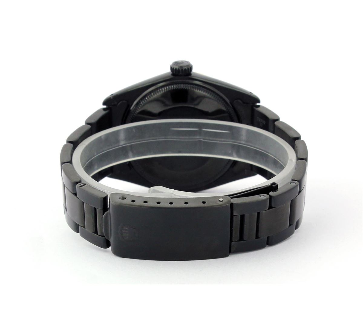 One Gents Rolex Datejust Polished, Serviced & Electronically Tested, PVD DLC Case:36mm, PVD DLC Crown, Bezel: 18K Yellow Gold Smooth Bezel Custom Crystal: Synthetic Sapphire Cyclops Lens. Movement: Automatic Winding Movement Caliber 1570. Dial: Green Dial with Diamond Hour Markers, Diamond Count: 10 Diamonds, Color: G to H, Clarity: SI-VS. Date Window: 3 O'Clock Position Date Display, Nonquick, Model: 1500 Condition: G-6 Extra Fine. Also comes with a Custom Brown Leather Band. 6.5 Inch Length, Adjustable. Custom Clasp.