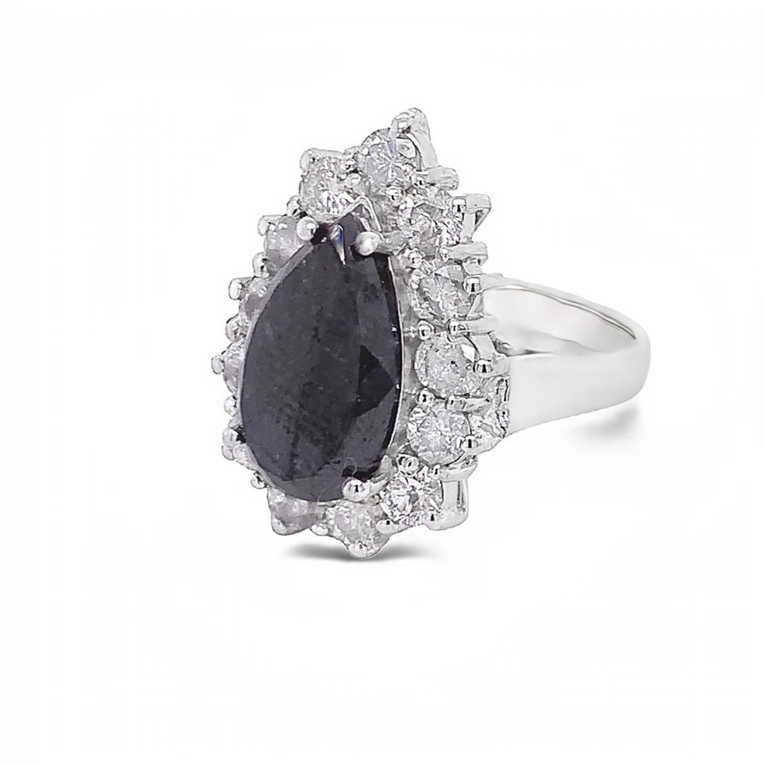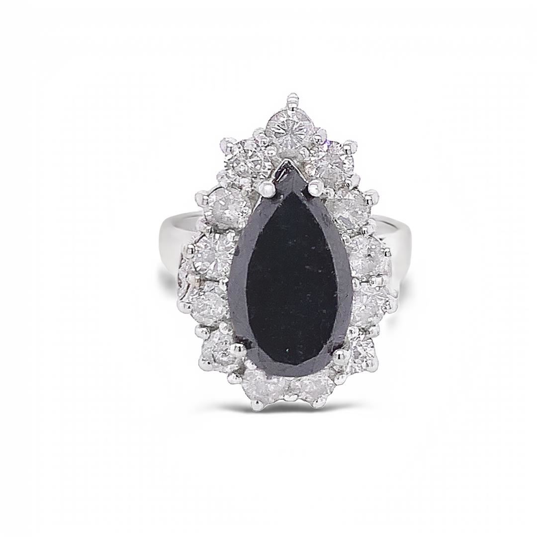 Black Diamond Ring. Please see Photos and Description for all available information. The pear-shaped black diamond, also known as the "Heart of Eternity," is a symbol of eternal love. The 5.62ct black diamond is surrounded by a 1.84ct white diamond halo and framed with a 14K white gold band.