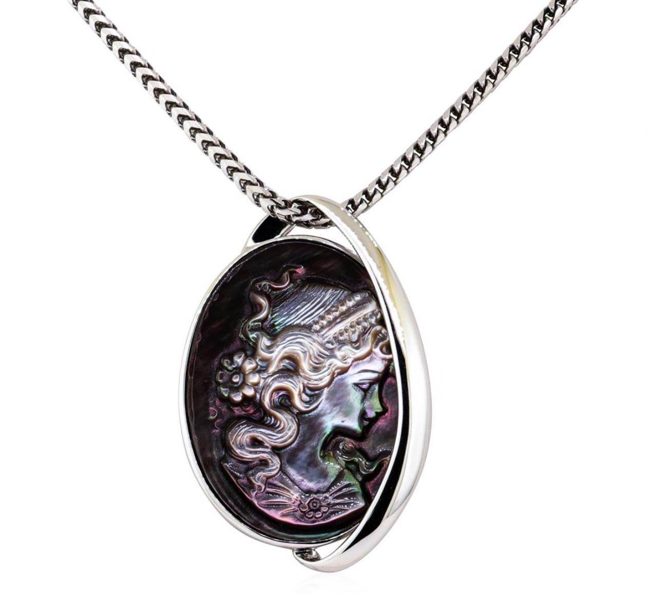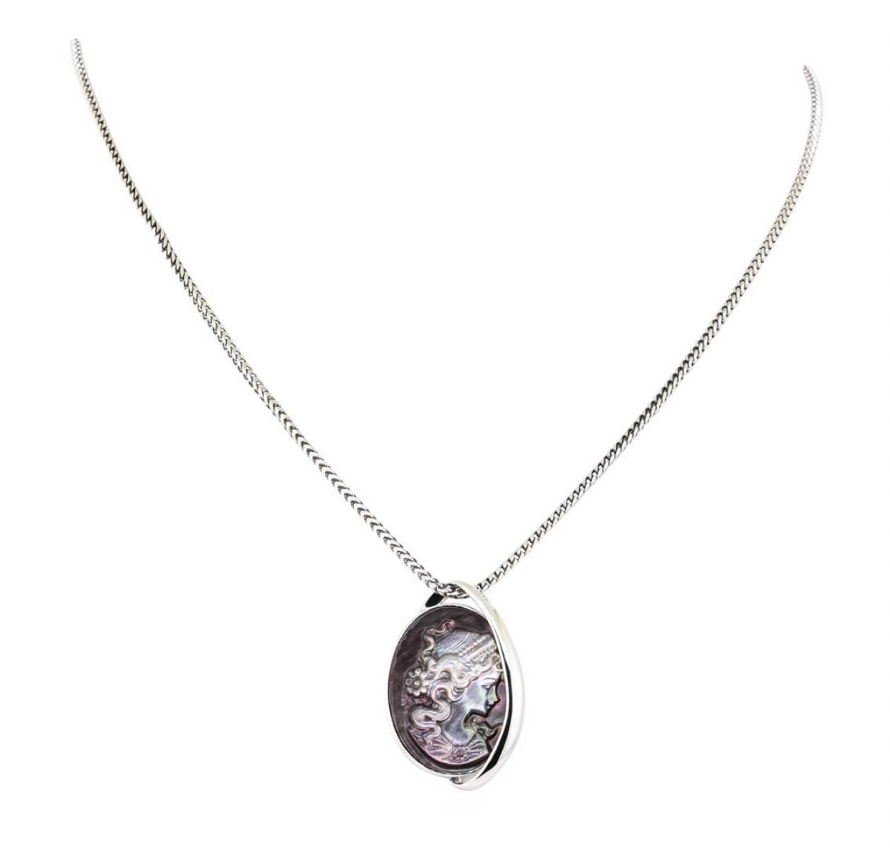 One pendant with an attached twenty inch 2 millimeter rounded wheat link chain featuring: 14KT white gold weighing 18.9 grams containing one oval shaped black mother of pearl hand-engraved cameo measuring approximately 30 by 21 millimeters.