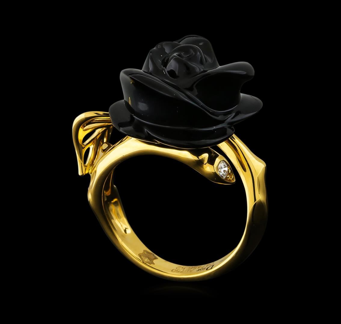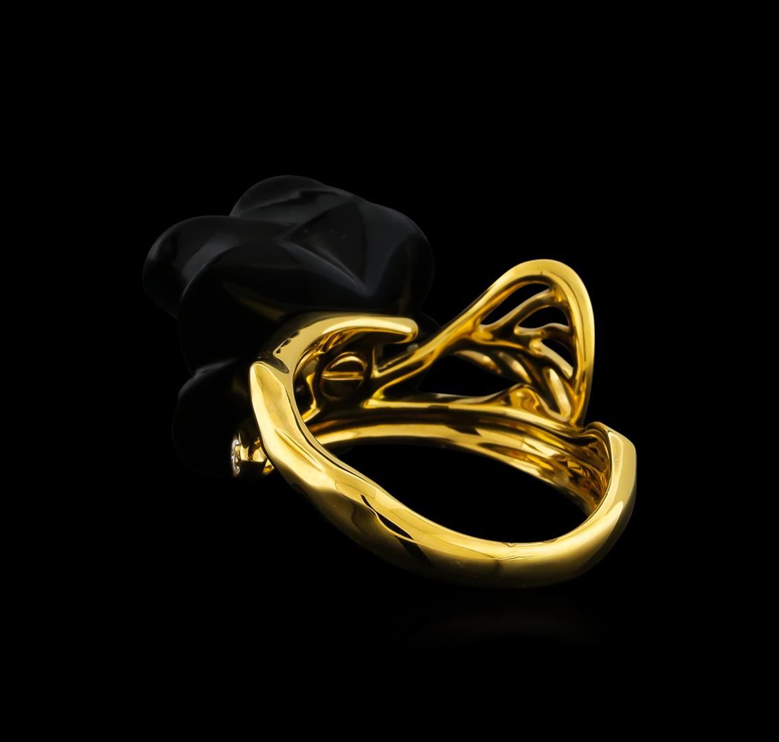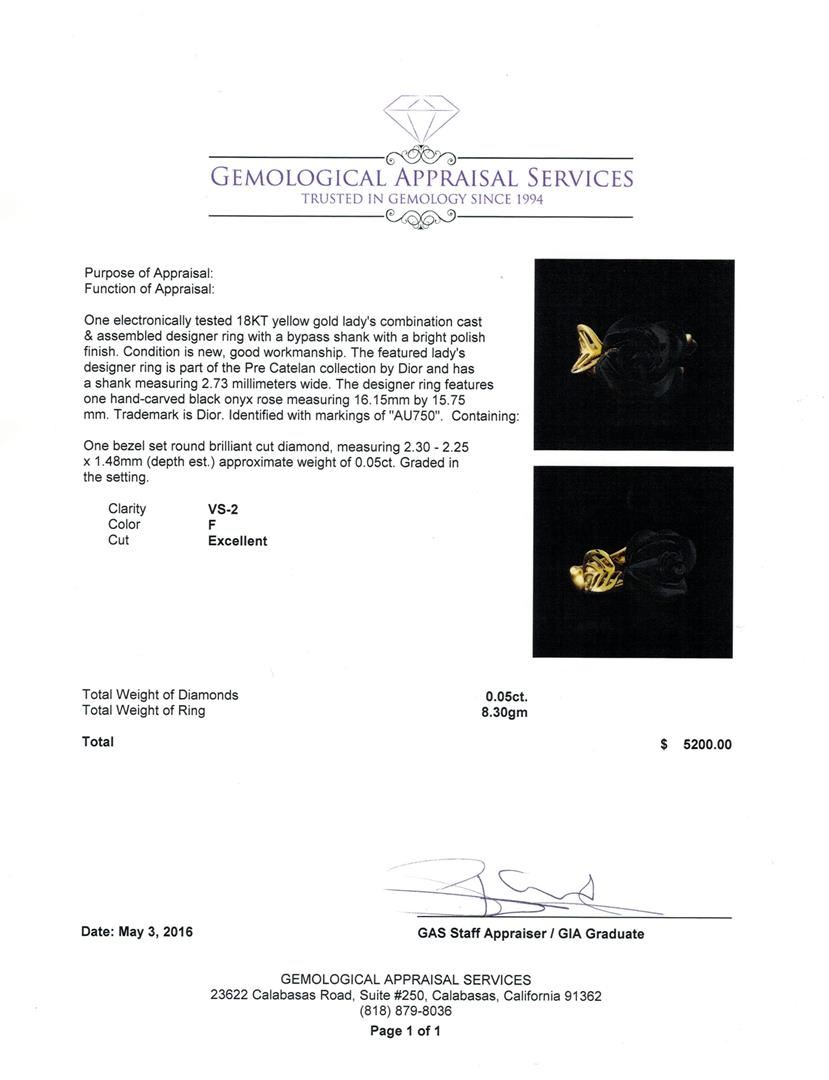One electronically tested 18KT yellow gold lady's combination cast & assembled designer ring with a bypass shank with a bright polish finish. The featured lady's designer ring is part of the Pre Catelan collection by Dior and has a shank measuring 2.73 millimeters wide. The designer ring features one hand-carved black onyx rose measuring 16.15mm by 15.75 mm. Trademark is Dior. Identified with markings of "AU750". Condition is new, good workmanship. Containing: One bezel set round brilliant cut diamond, measuring 2.30 - 2.25 x 1.48mm (depth est.) approximate weight of 0.05ct. Graded in the setting. Clarity: VS-2. Color: F. Cut Excellent. Total Weight of Diamonds 0.05ct. Total Weight of Ring 8.30gm GAS Appraised at $5,200.00.