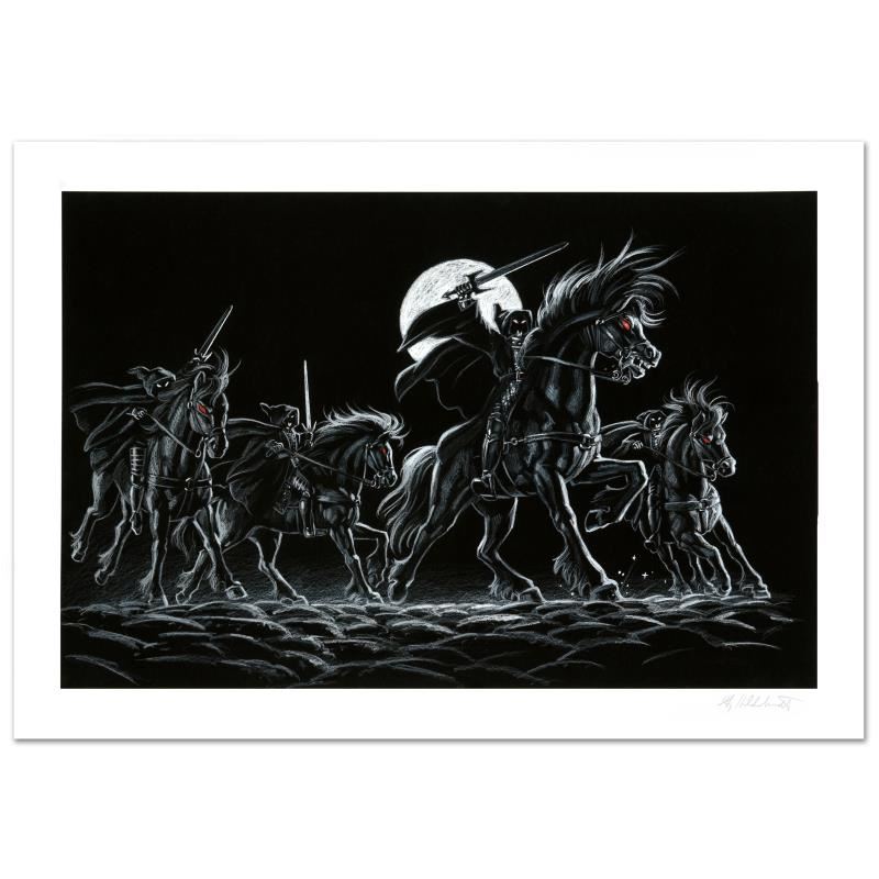 Known world wide for his fantasy and science fiction illustrations, Greg Hildebrandt has created an abundance of fascinating artwork including, and most notably his illustration work for J.R.R. Tolkien's 'The Hobbit' and 'Lord of the Rings'. "Black Riders", originally created in the 1970's for Ballantine Books, is a limited edition giclee on paper, numbered and hand signed by Greg Hildebrandt! Includes Certificate of Authenticity! Measures approx. 34" x 23.5" (with border), 30" x 19.5" (image).