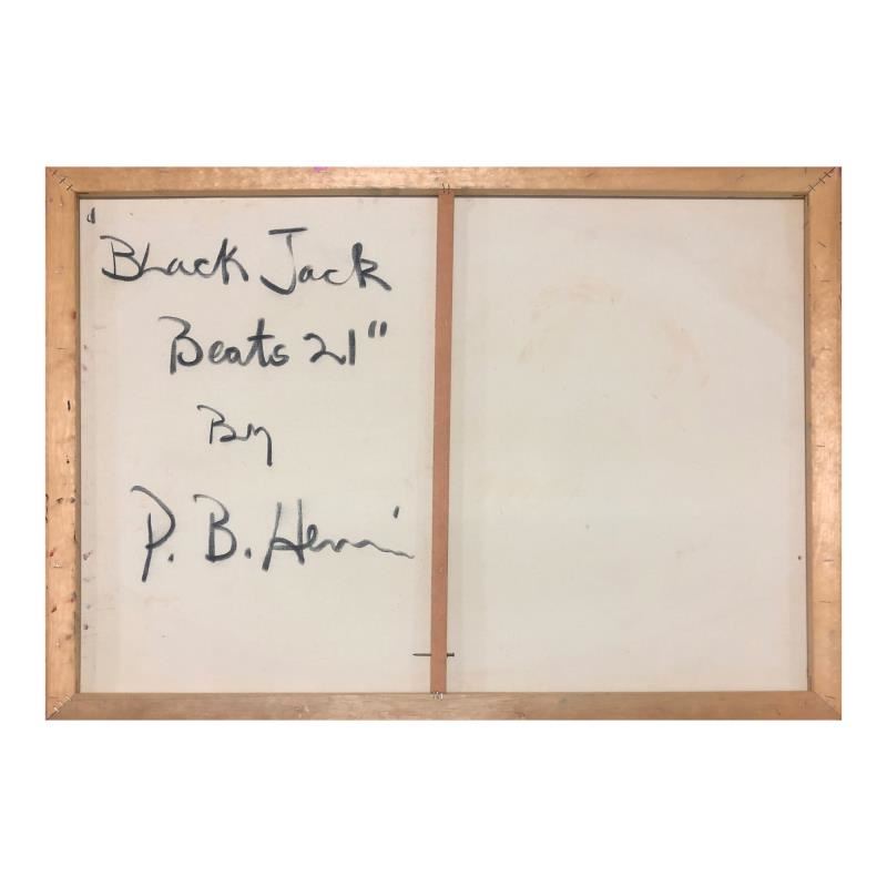 Blackjack Beats 21 by Henrie (1932-1999). Please see photos and description for all available information. "Blackjack Beats 21" is an original oil painting on stretched canvas by Paul Blaine Henrie (1932-1999). The piece is hand signed by the artist and comes with a letter of authenticity. Please note that due to the age of this piece and the way it was stored, there are minor sings of wear, particularly on the corners and edges. Measures approximately. 30" x 40" (image).