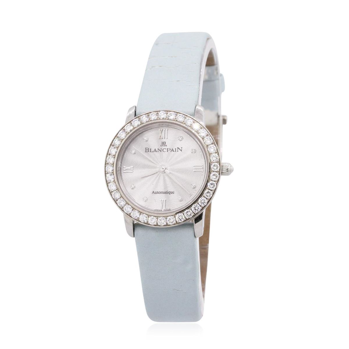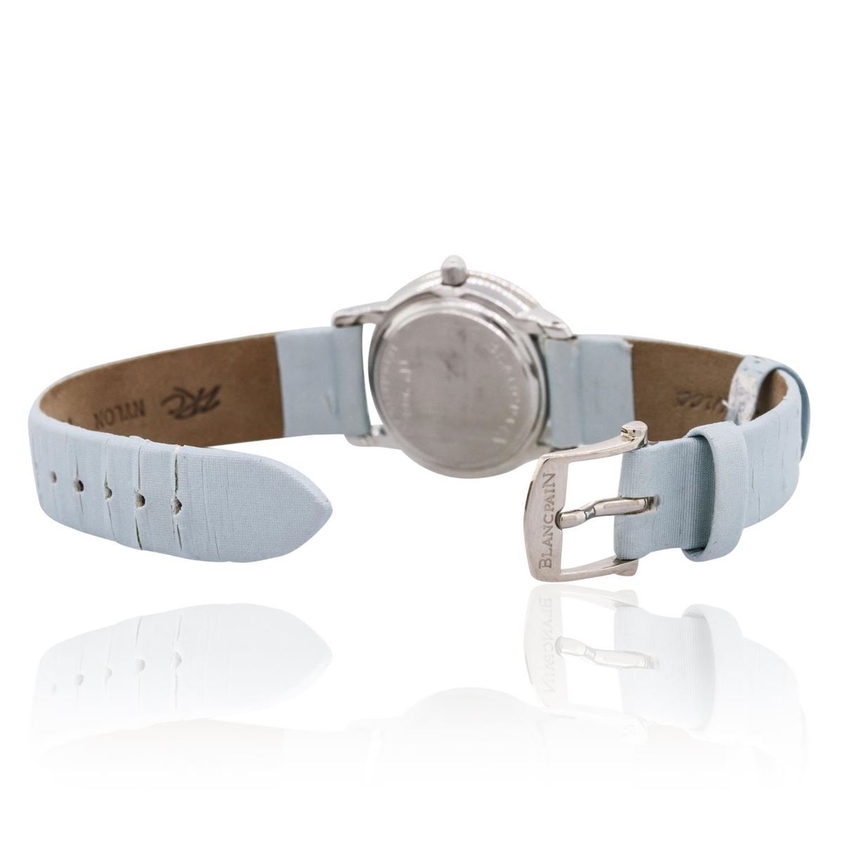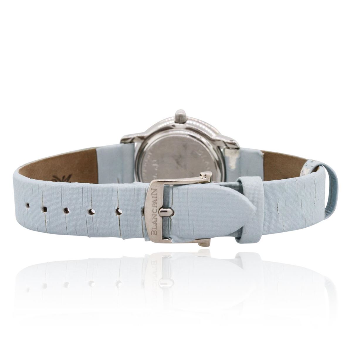 One Blancpain Villeret wristwatch featuring: 18KT White Gold case, crown, lugs, Diamond bezel, blue leather bracelet with buckle, Swiss automatic movement, white mother of pearl dial with analog display, hour and minute hands, Roman numerals, diamond hour markers. This item measures 30mm across, including crown, and weighs a total of 26.60 grams.
