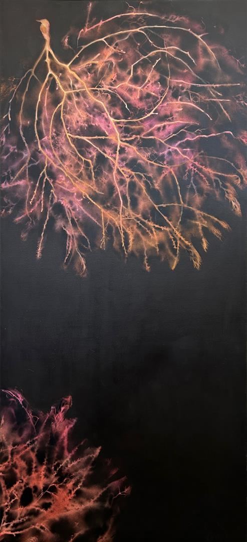A luminescent impression of tumbleweed on a black background. 45x24" Original acrylic on stretched canvas by Marion Wood . COA.