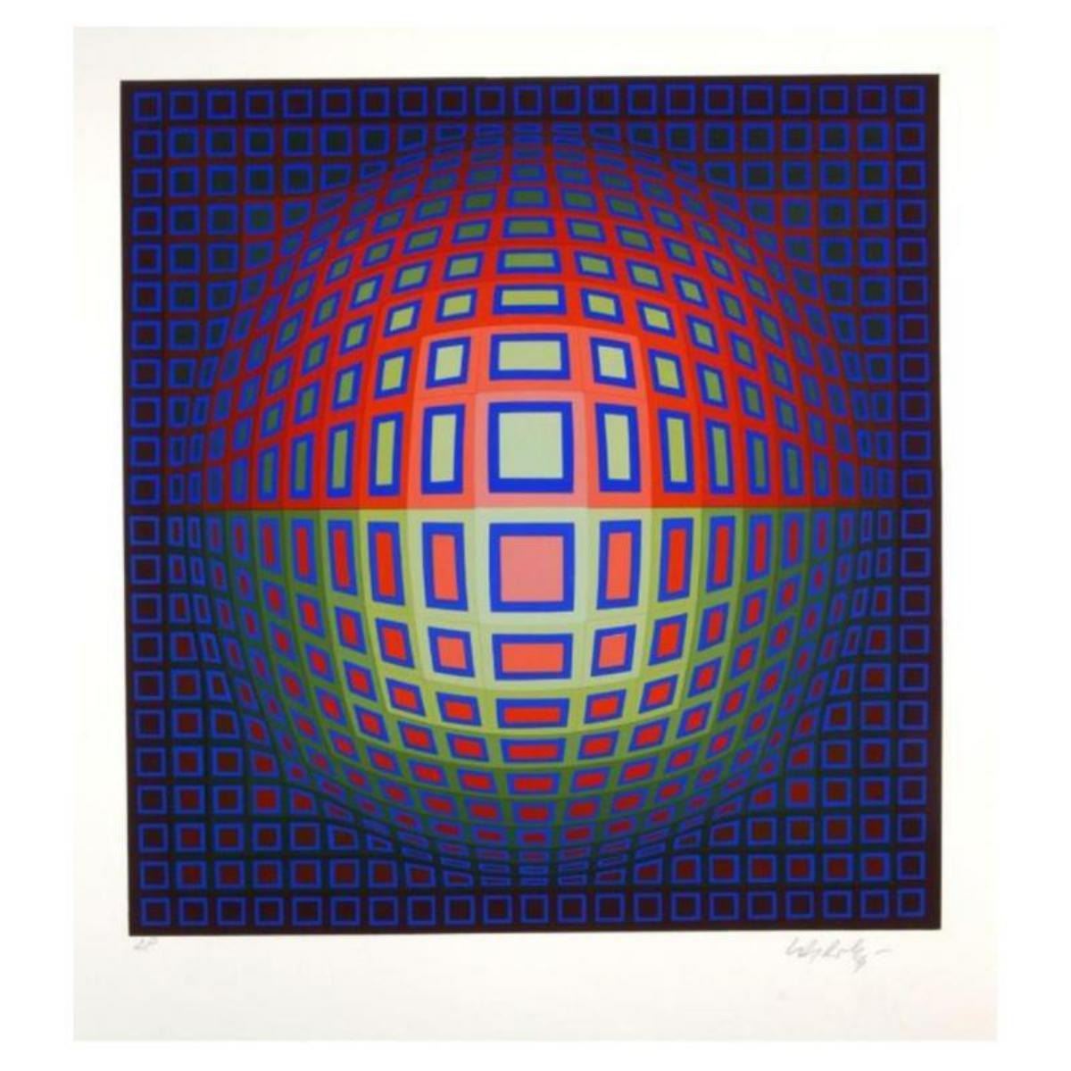 Blue Composition by Vasarely (1908-1997). "Blue Composition", is a limited edition Serigraph on Paper by Victor Vasarely (1908-1997). Numbered and hand signed, this piece is accompanied by a letter of authenticity. Measures approximately 18" x 18" (image).