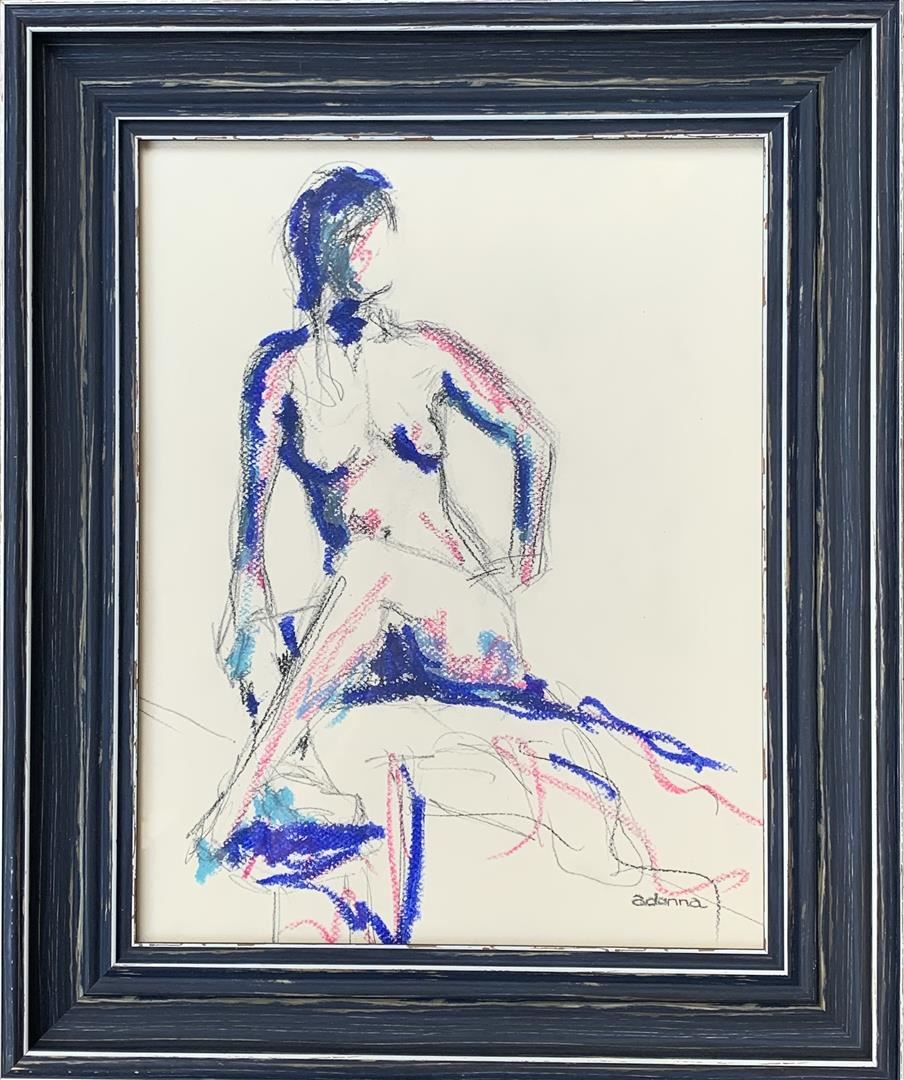 Graphite and oil pastel on paper, framed (blue&white) 15" x 18", by Adonna (Framed) COA