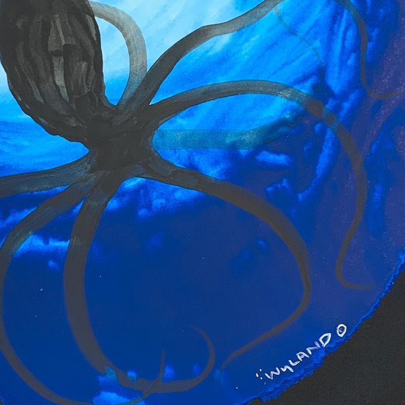 "Blue Octopus Swirl" is an original painting, watercolor on deckle edge paper by Wyland. Hand signed by the artist, the piece comes custom framed and with a letter of authenticity. Measures approximately 30" x 30" (framed), 19.5" x 19.5" (image).
