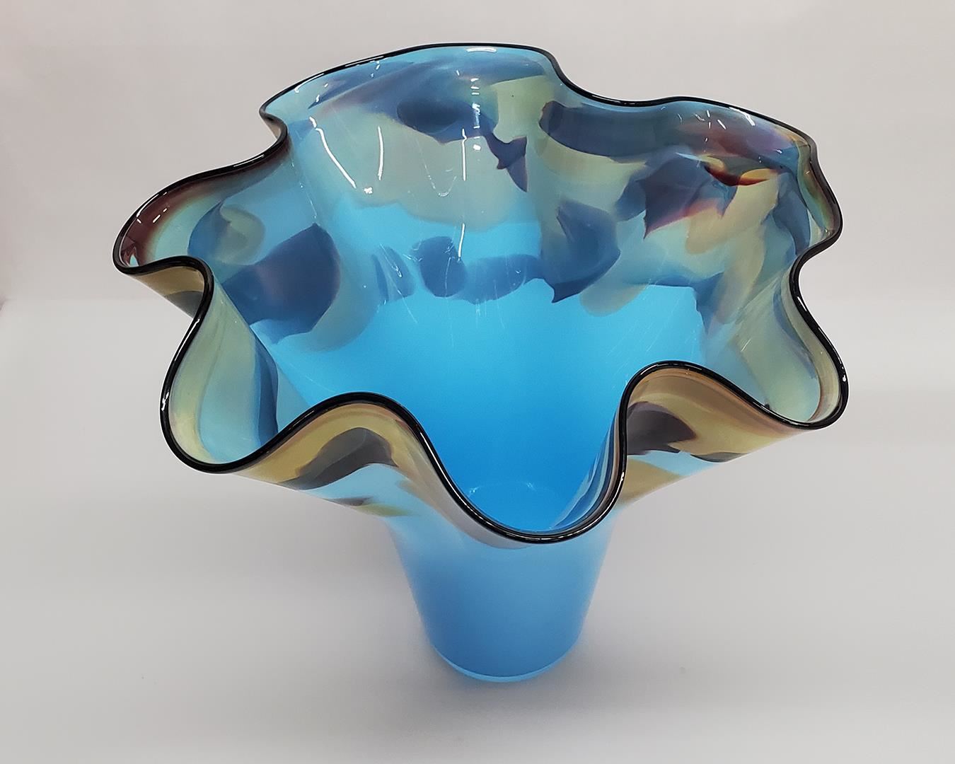 Blue colored fluted vase with brown speckles, this piece measures 14.25" tall and 15.75" diameter.