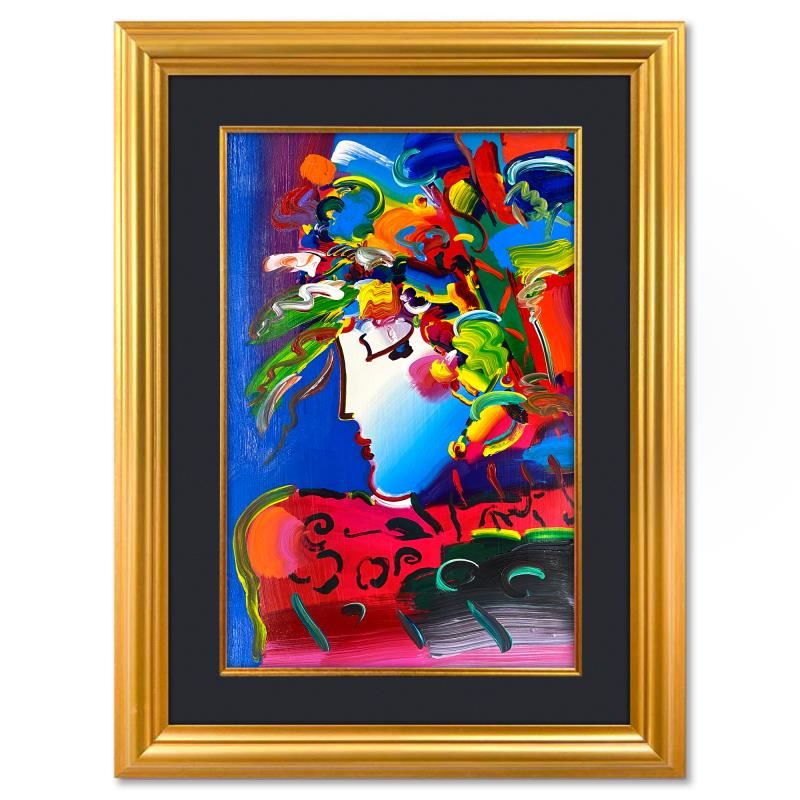 "Blushing Beauty" is a one-of-a-kind mixed media on paper, hand signed by Peter Max. The piece comes custom framed with a backside cutout to display Peter Max Studio registration number 236333 certifying authenticity. Measures approximately 48" x 36" (frame), 36" x 24" (image).