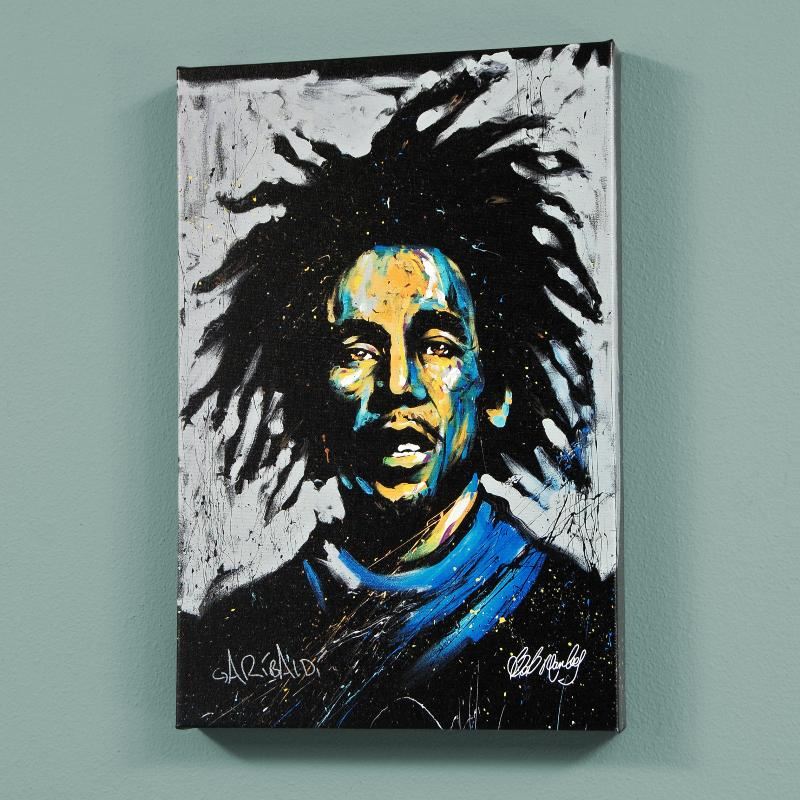 Combining his passions for music and art, David Garibaldi creates stunning visual poetry. "Bob Marley (Redemption)" is a limited edition giclee on stretched canvas, numbered from the miniature series and bearing the artist's authorized signature. This piece comes gallery wrapped. Includes Certificate of Authenticity! Measures approx. 12" x 18" (image).