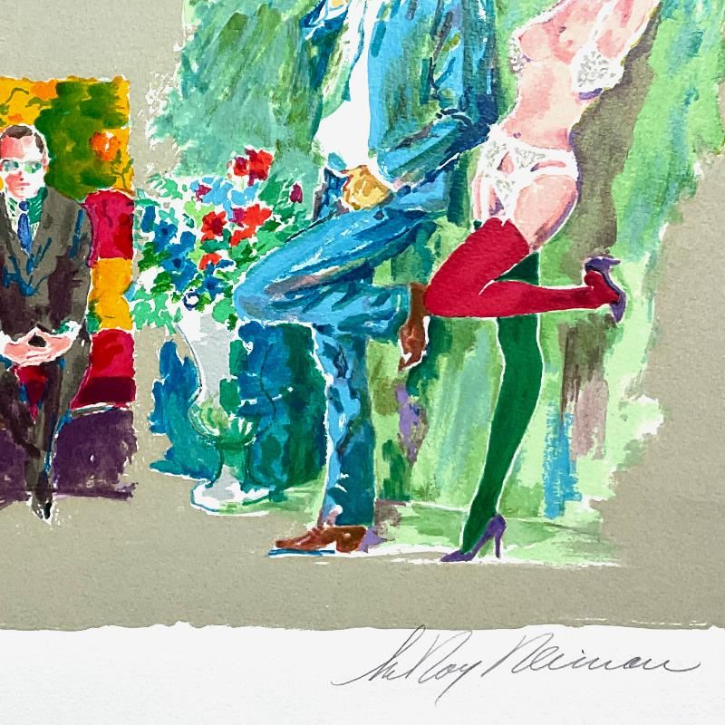 "Bordello" is a limited edition serigraph on paper by LeRoy Neiman (1921-2012), numbered 67/270 and hand signed by the artist. Includes Letter of Authenticity. Measures approx. 43.5" x 34.5" (border), 36.5" x 26.5" (image). Due to the age of the piece there is very minor creasing in the white border area that will be concealed when framed. ** Please note: there is noticeable crease in the white border (top-left) area adjacent to the image. **
