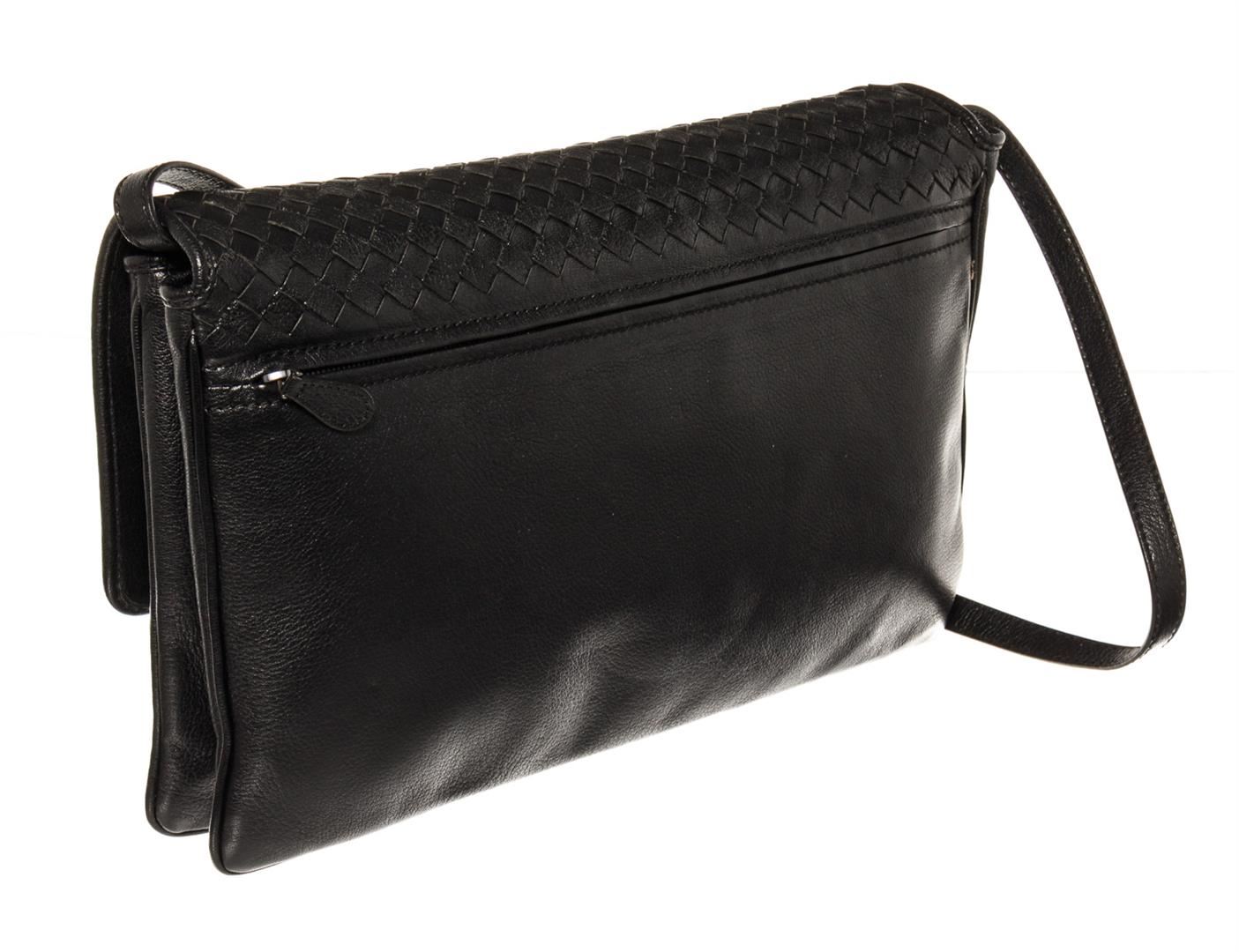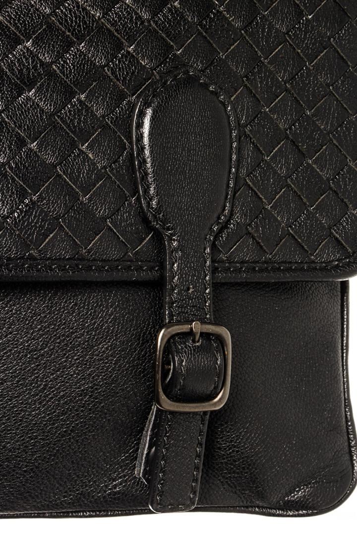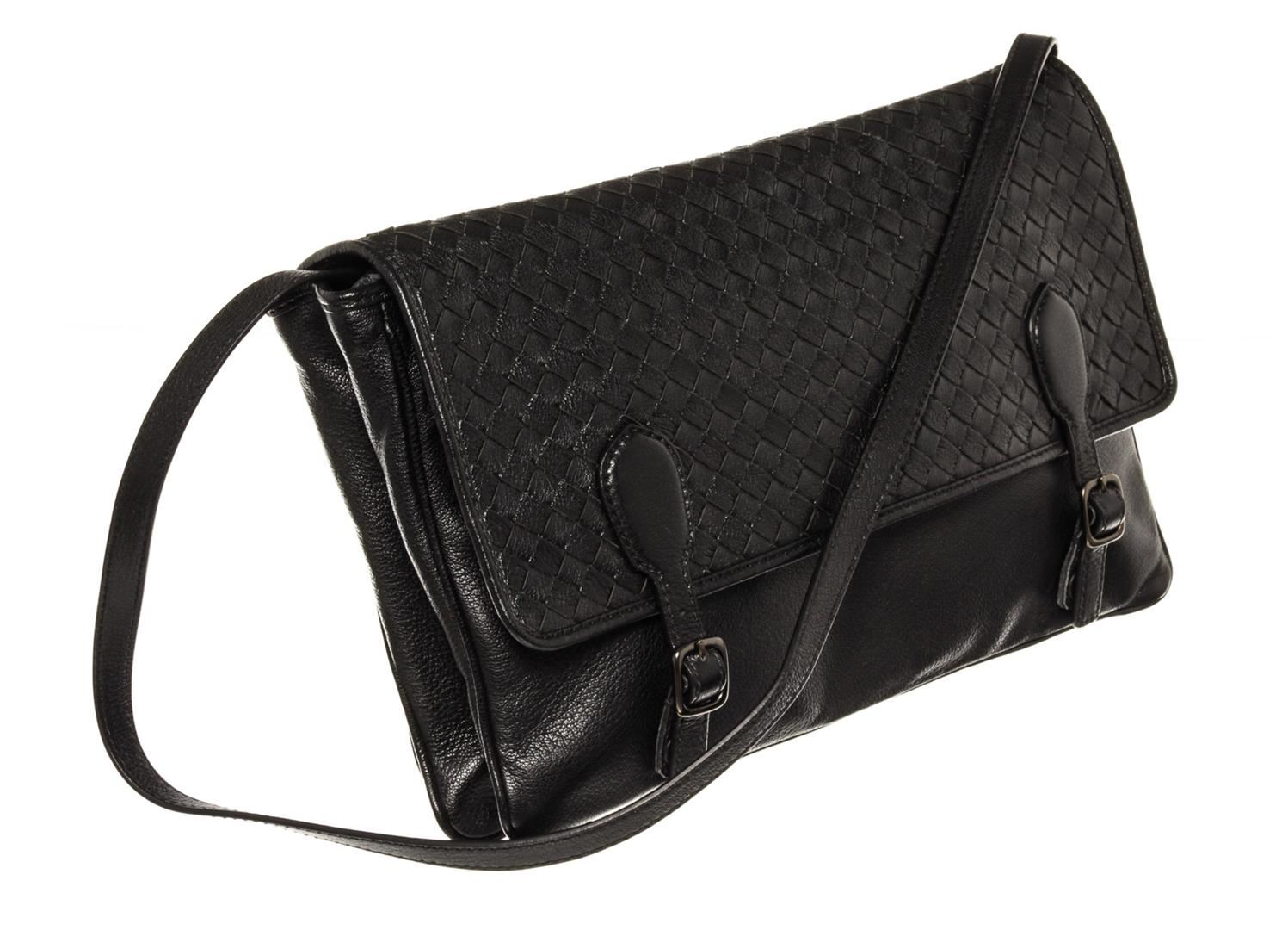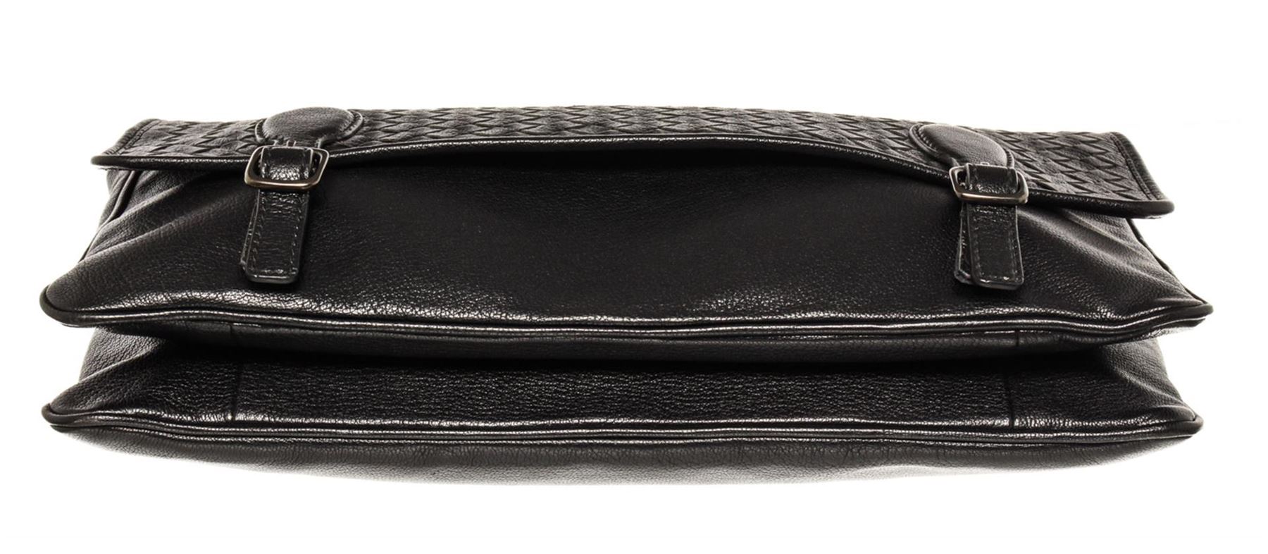 Black smooth leather with woven Intrecciato accent Bottega Veneta Buckle large messenger bag with dark silver-tone hardware, single flat shoulder strap, flap at top with dual buckle closures, brown suede lining and outer zip pocket. 13.0" W x 9.25" H x