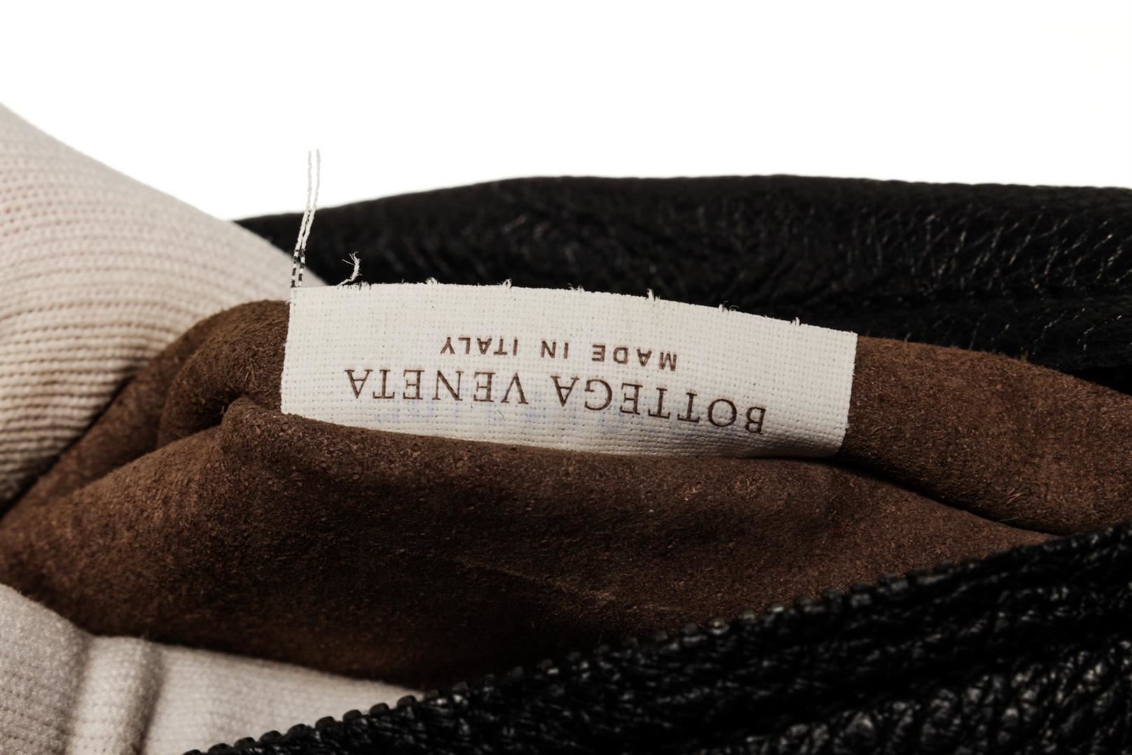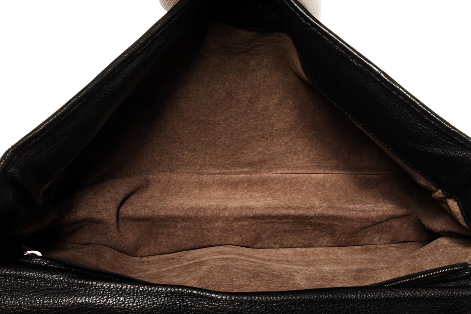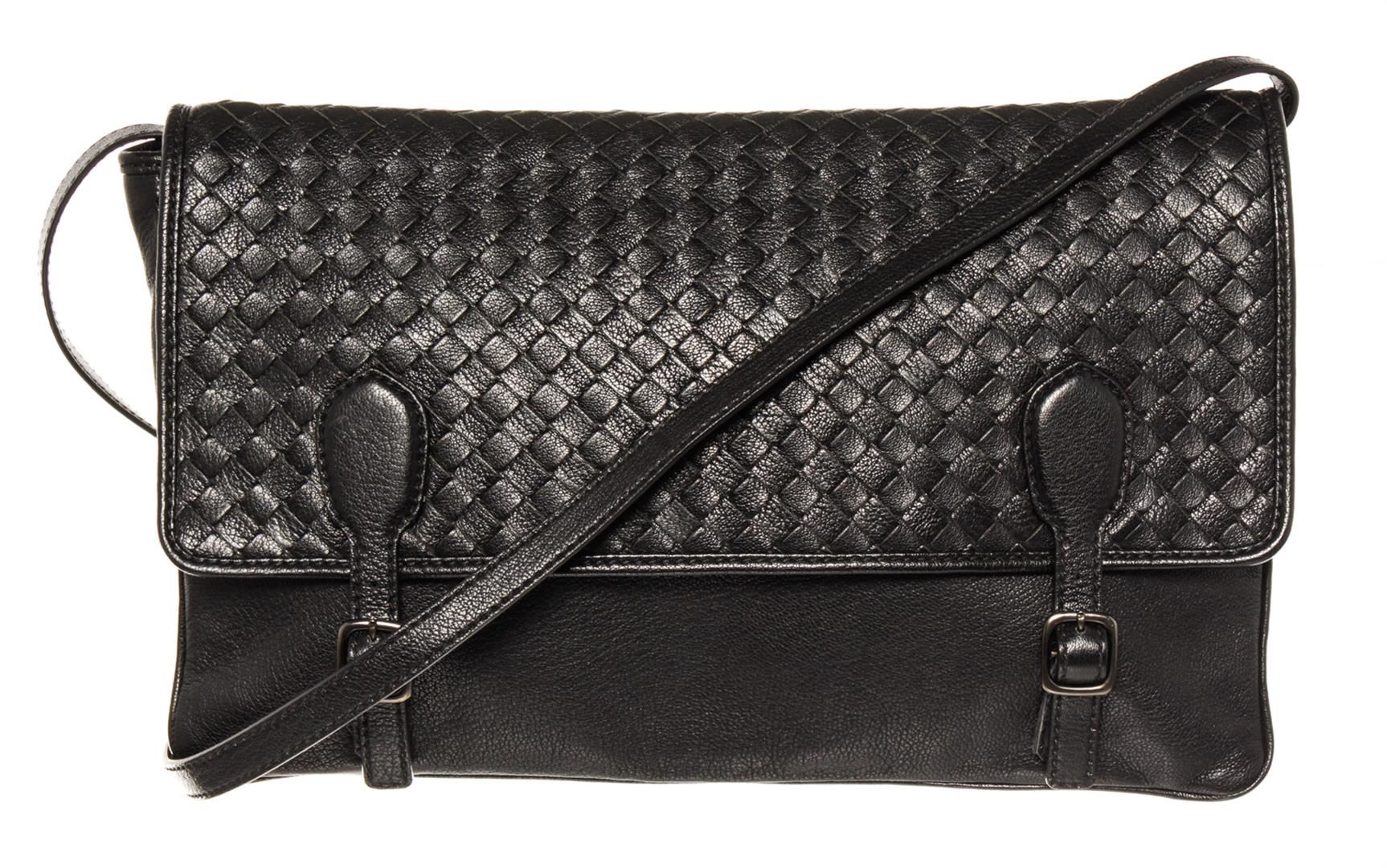 Black smooth leather with woven Intrecciato accent Bottega Veneta Buckle large messenger bag with dark silver-tone hardware, single flat shoulder strap, flap at top with dual buckle closures, brown suede lining and outer zip pocket. 13.0" W x 9.25" H x