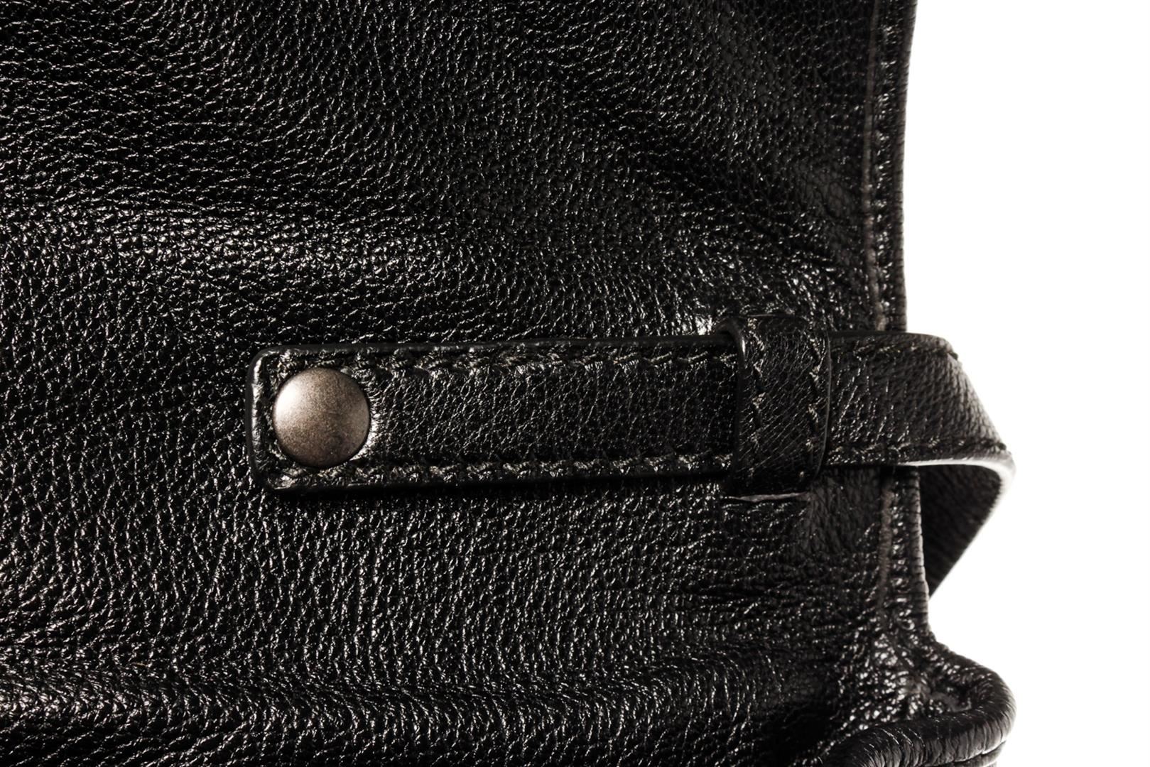 Black smooth leather with woven Intrecciato accent Bottega Veneta Buckle large messenger bag with dark silver-tone hardware, single flat shoulder strap, flap at top with dual buckle closures, brown suede lining and outer zip pocket. 13.0" W x 9.25" H x