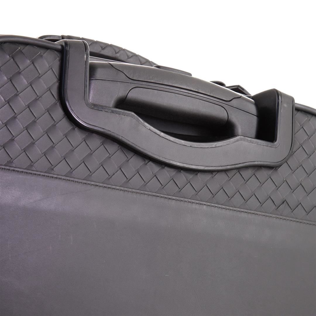 One Bottega Veneta Black Leather Leather Medium Trolley Rolling Luggage. Item is sold AS-IS. All available information is listed in the description and shown in the photo. Bottega Veneta Black Leather Leather Medium Trolley Rolling Luggage Condition Details: Heavy wear on base corners, scuffs and marks on exterior. Wear on handle, darkening on interior opening edge, scratches on hardware. Measurements: Height 18.5", Width 14.5", Depth 8", Strap Drop 20.5