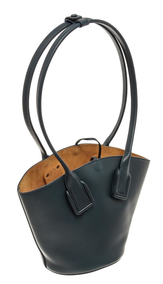 One Bottega Veneta Blue Leather Basket Tote. Item is sold AS-IS. All available information is listed in the description and shown in the photo. Bottega Veneta Blue Leather Basket Tote with silver tone hardware, blue leather trim, tan suede lining, dual top handles, features a removable zipper pouch, and a open top closure.