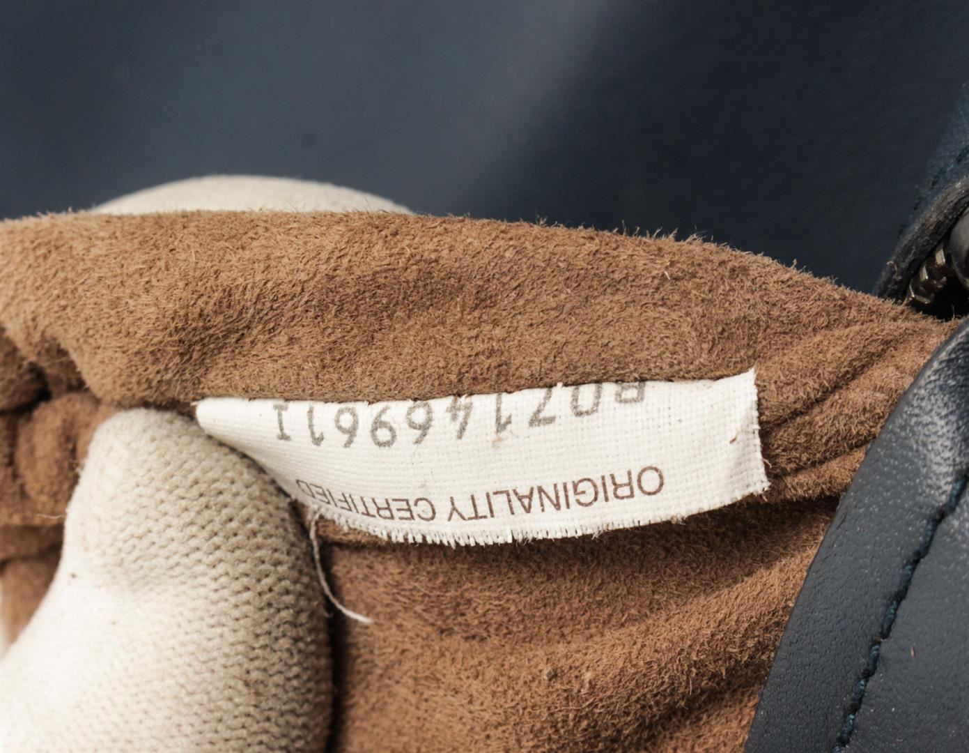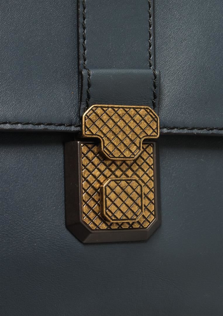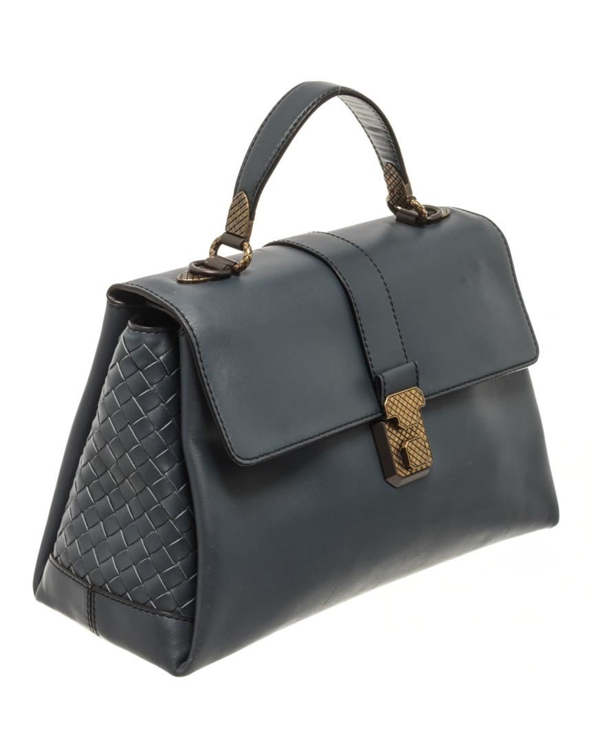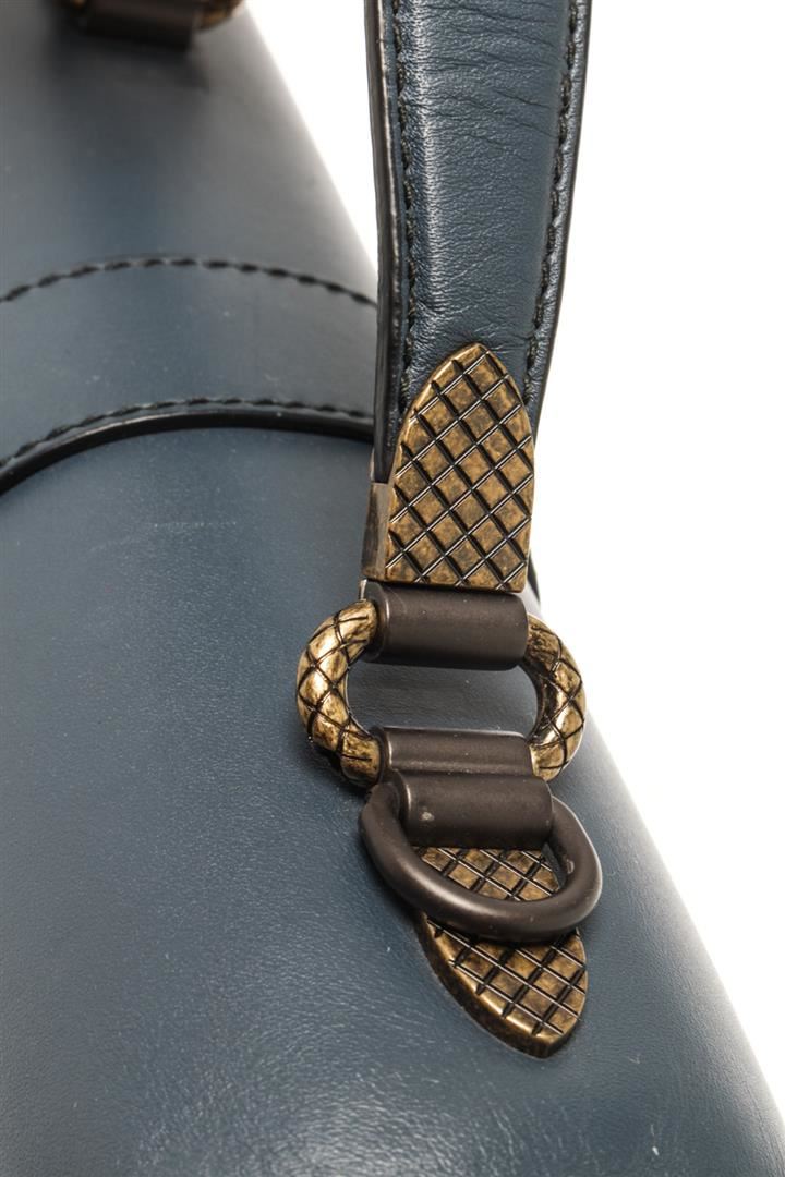 Bottega Veneta Blue Leather Piazza Top Handle Bag. All available information is listed in the description and shown in the photos. Bottega Veneta Blue Leather Piazza Top Handle Bag with top handle, detachable strap, suede lining, zip and slip interior pocket, snap closure. Height: 7.5 in (19.05 cm), Width: 12 in (30.48 cm), Depth: 5.5 in (13.97 cm)