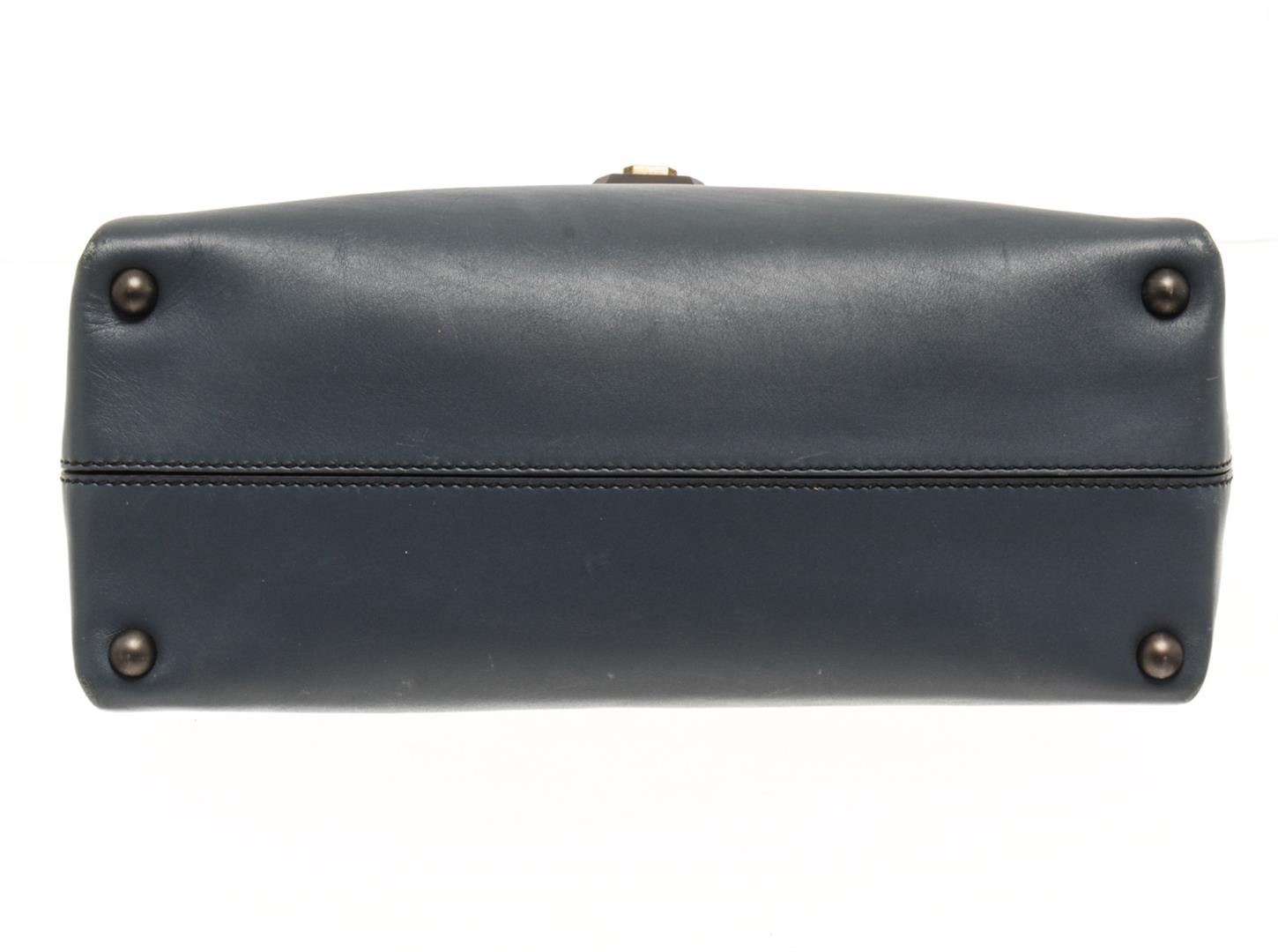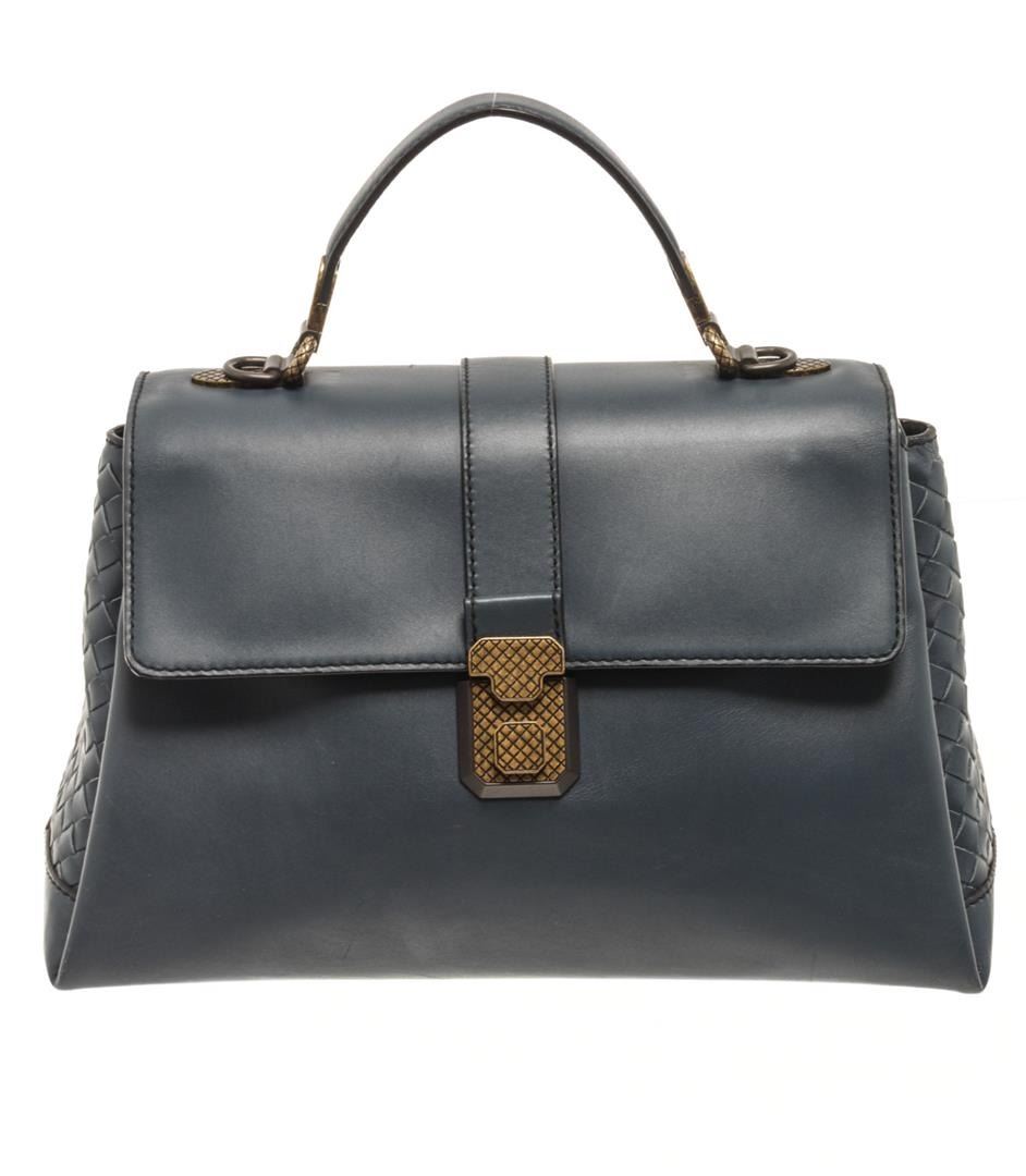 Bottega Veneta Blue Leather Piazza Top Handle Bag. All available information is listed in the description and shown in the photos. Bottega Veneta Blue Leather Piazza Top Handle Bag with top handle, detachable strap, suede lining, zip and slip interior pocket, snap closure. Height: 7.5 in (19.05 cm), Width: 12 in (30.48 cm), Depth: 5.5 in (13.97 cm)