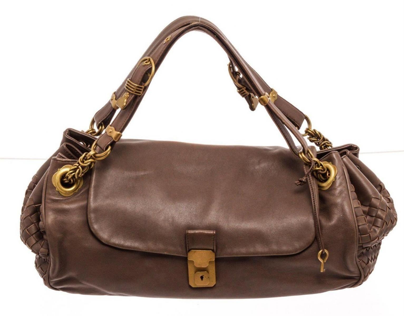 Bottega Veneta Brown Leather Handbag. Bottega Veneta Brown Leather Handbag with gold-tone hardware, trim leather, dual top handle, shoulder strap and push lock closure. MEASUREMENTS: Length 6.75 in / 17 cm Width 12 in / 30 cm Height 6.25 in / 16 cm