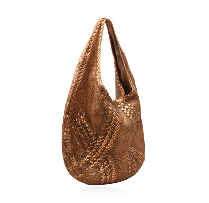 Bottega Veneta Copper Deerskin Cervo Hobo Bag ED1445 . One Bottega Veneta copper deerskin Cervo Hobo bag featuring: copper deerskin cervo leather, leather shoulder handle with woven details, 12 inch handle drop, one flat pocket with snap closure, one zip pocket, open middle hidden magnet closure, silver tone hardware and suede lining.