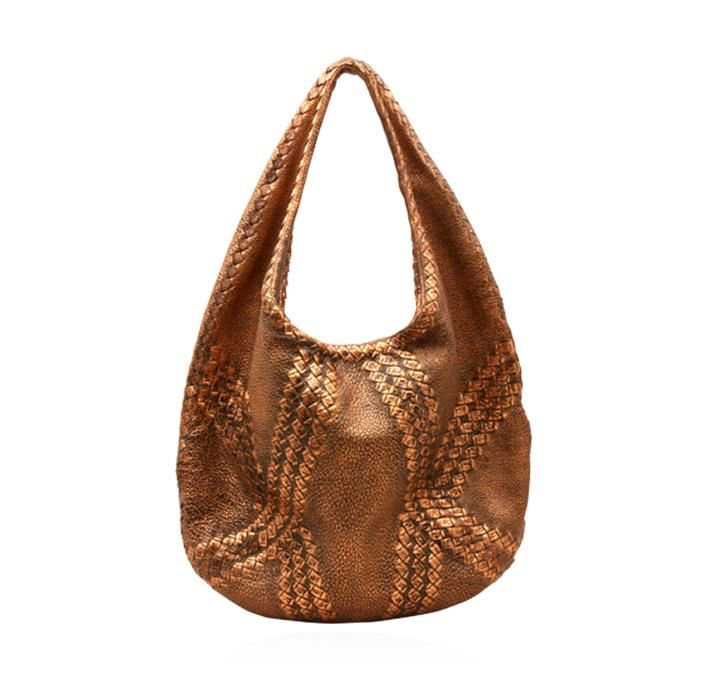 Bottega Veneta Copper Deerskin Cervo Hobo Bag ED1445 . One Bottega Veneta copper deerskin Cervo Hobo bag featuring: copper deerskin cervo leather, leather shoulder handle with woven details, 12 inch handle drop, one flat pocket with snap closure, one zip pocket, open middle hidden magnet closure, silver tone hardware and suede lining.