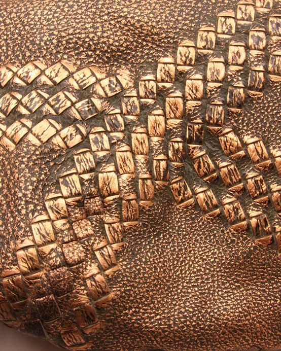 Bottega Veneta Copper Deerskin Cervo Hobo Bag ED1445 . One Bottega Veneta copper deerskin Cervo Hobo bag featuring: copper deerskin cervo leather, leather shoulder handle with woven details, 12 inch handle drop, one flat pocket with snap closure, one zip pocket, open middle hidden magnet closure, silver tone hardware and suede lining.
